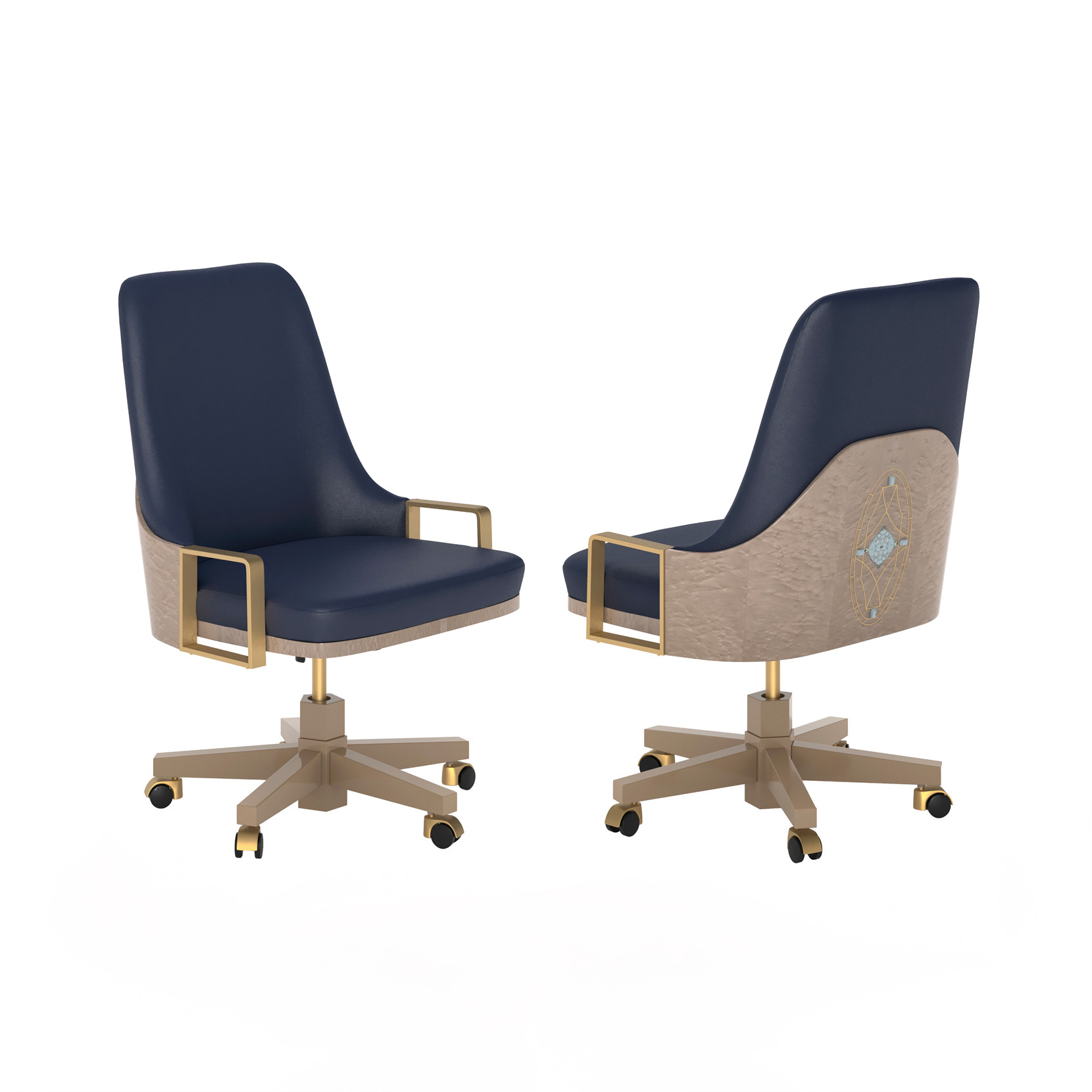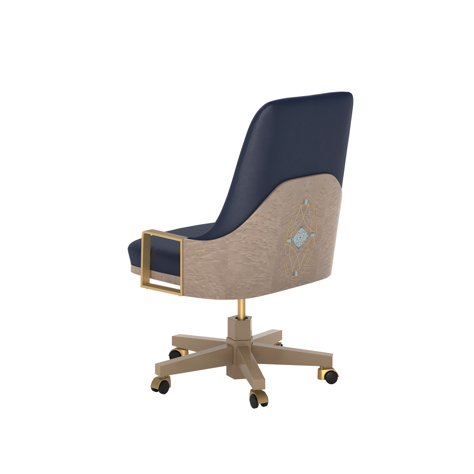 Swivel chair with bird's eye maple in sand colour veneered backrest, matt lacquered parts, fabric upholstery, metal elements in shiny light gold finish.