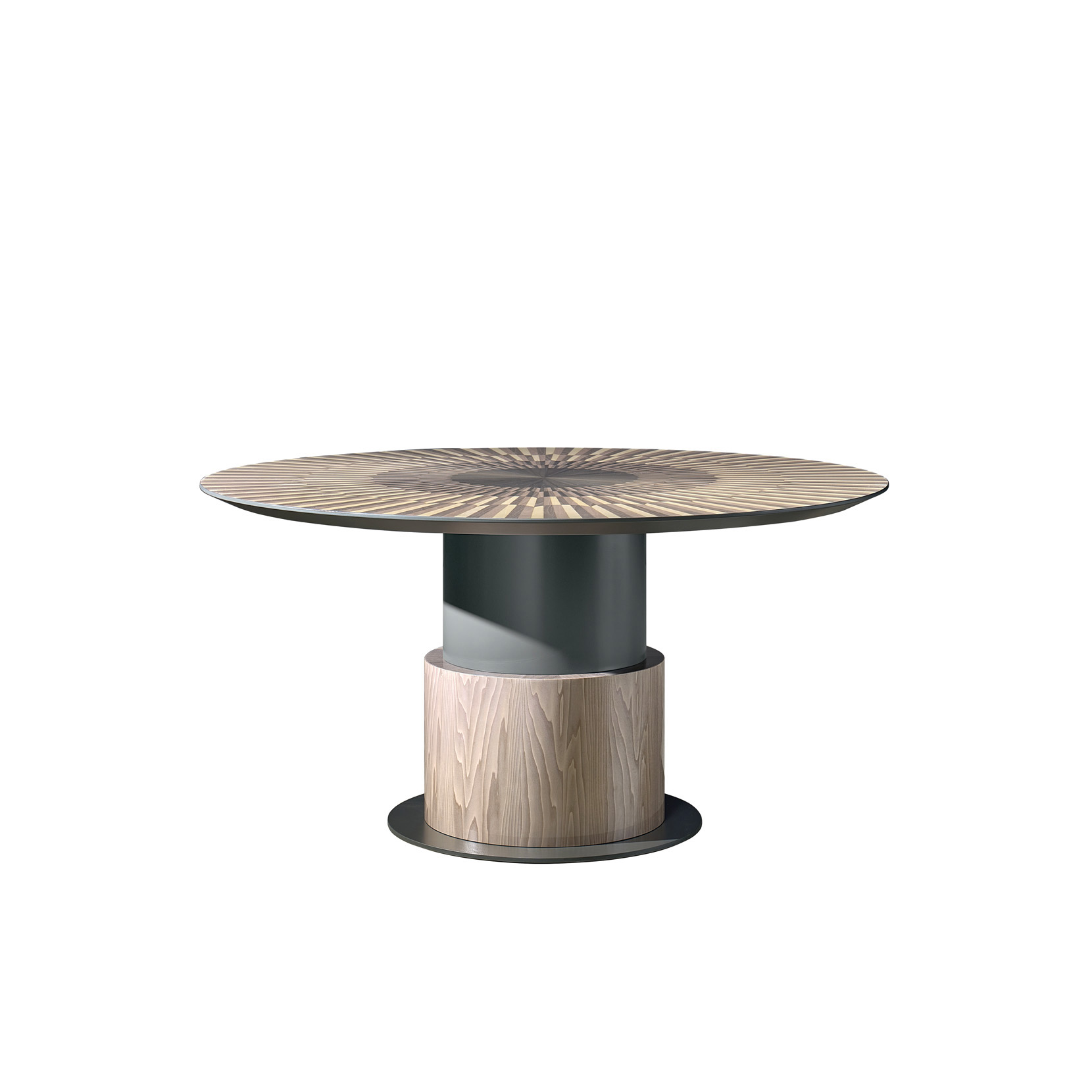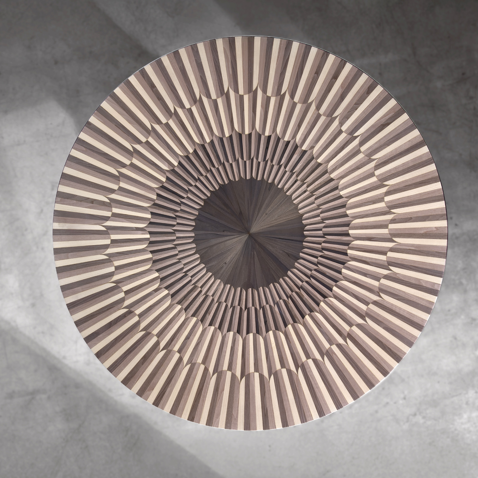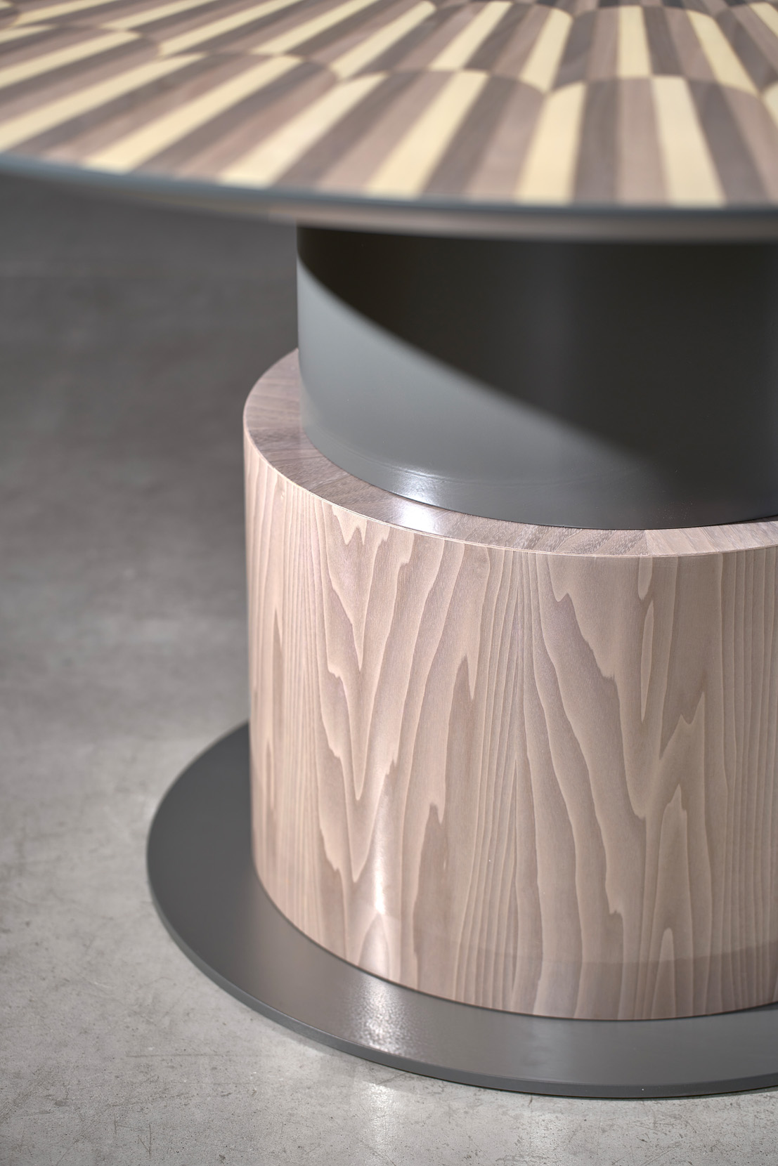 Round fixed table with wood inlaid top in 4 shades of grey, matching lacquered pedestal, matching veneered pedestal detail.