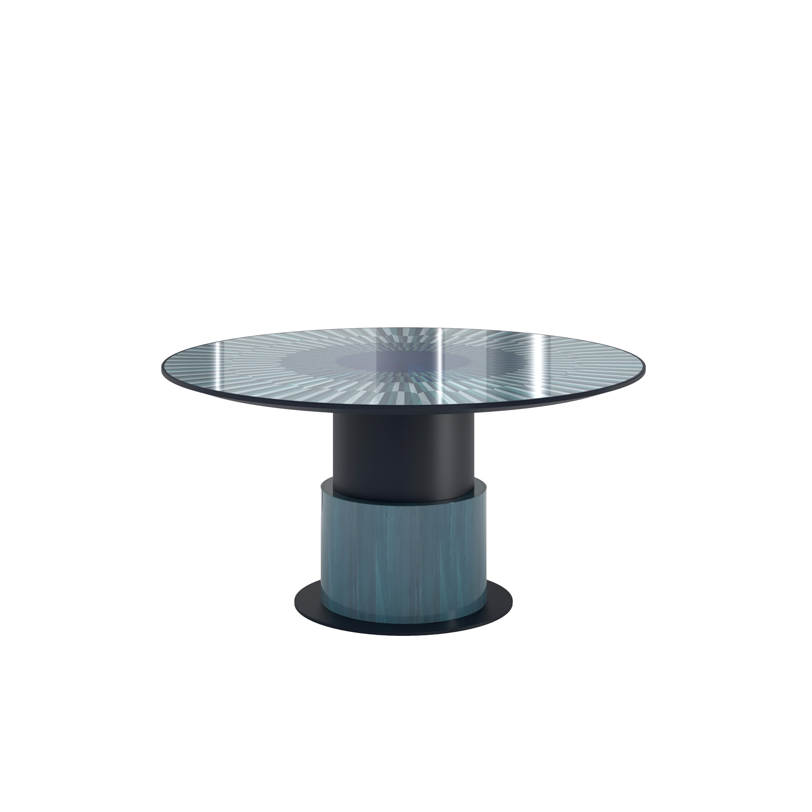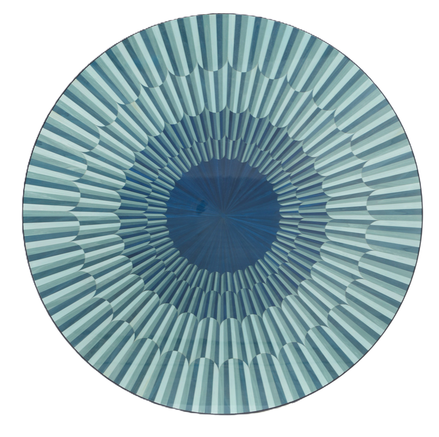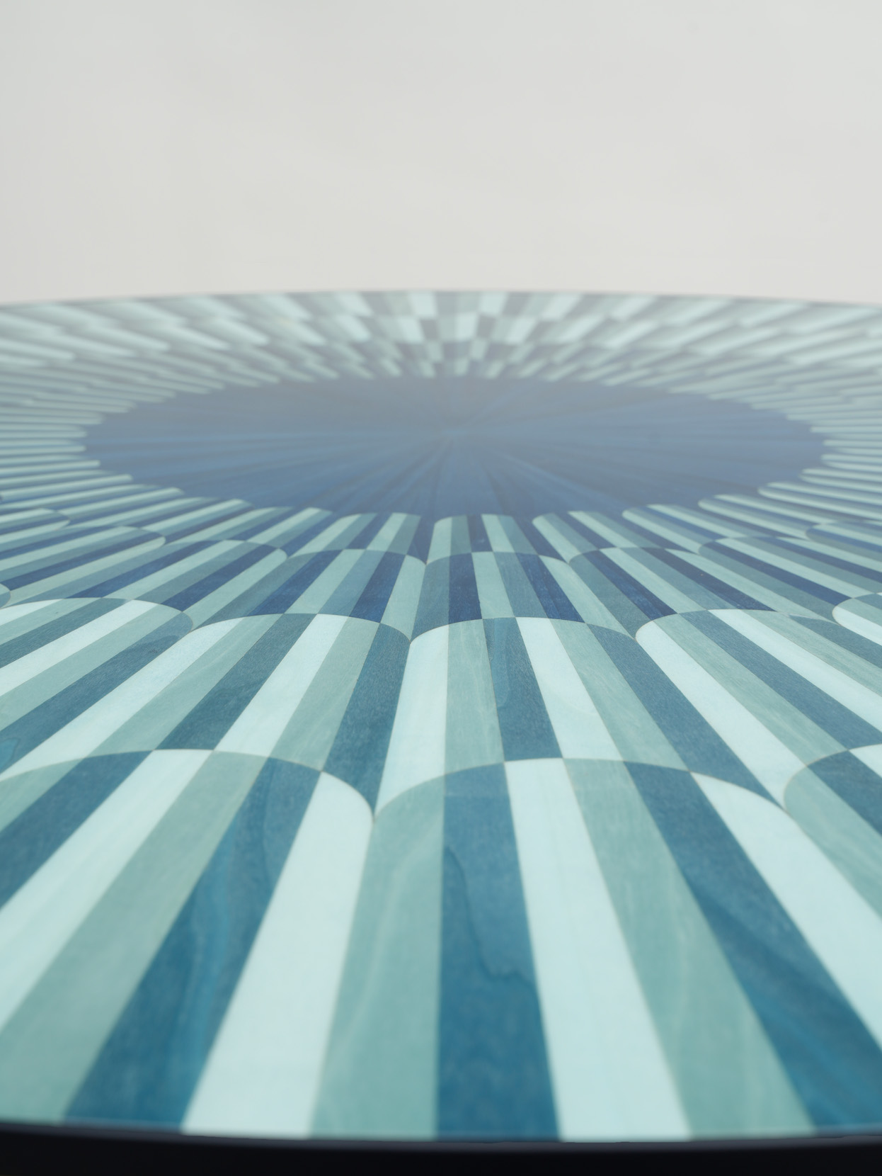 Round fixed table with wood inlaid top in 4 shades of blue, matching lacquered pedestal, matching veneered pedestal detail.