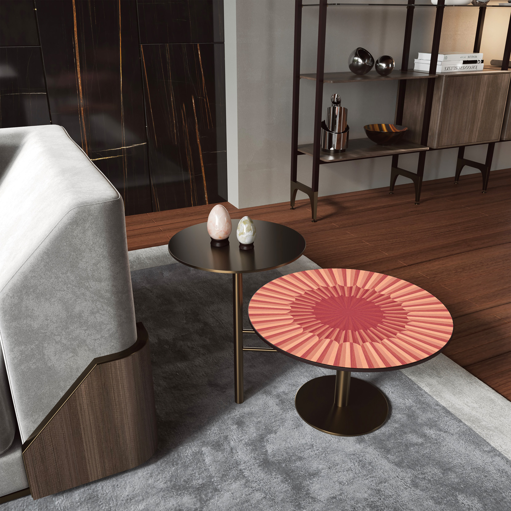Double side table with wood inlaid primary top in 4 shades of red, matt lacquered secondary top, metal structure.