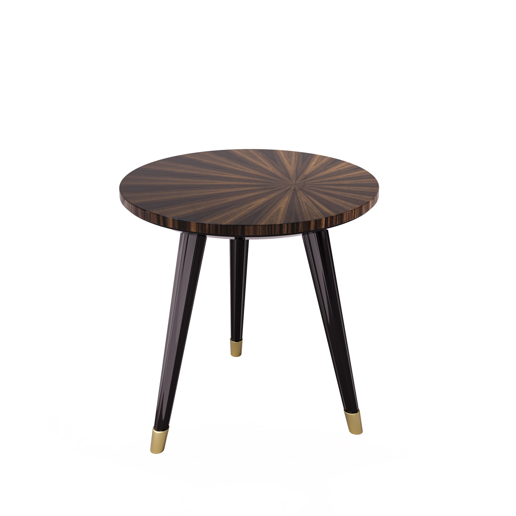 Round side table with ebony veneer, wooden lacquered legs, metal tips.