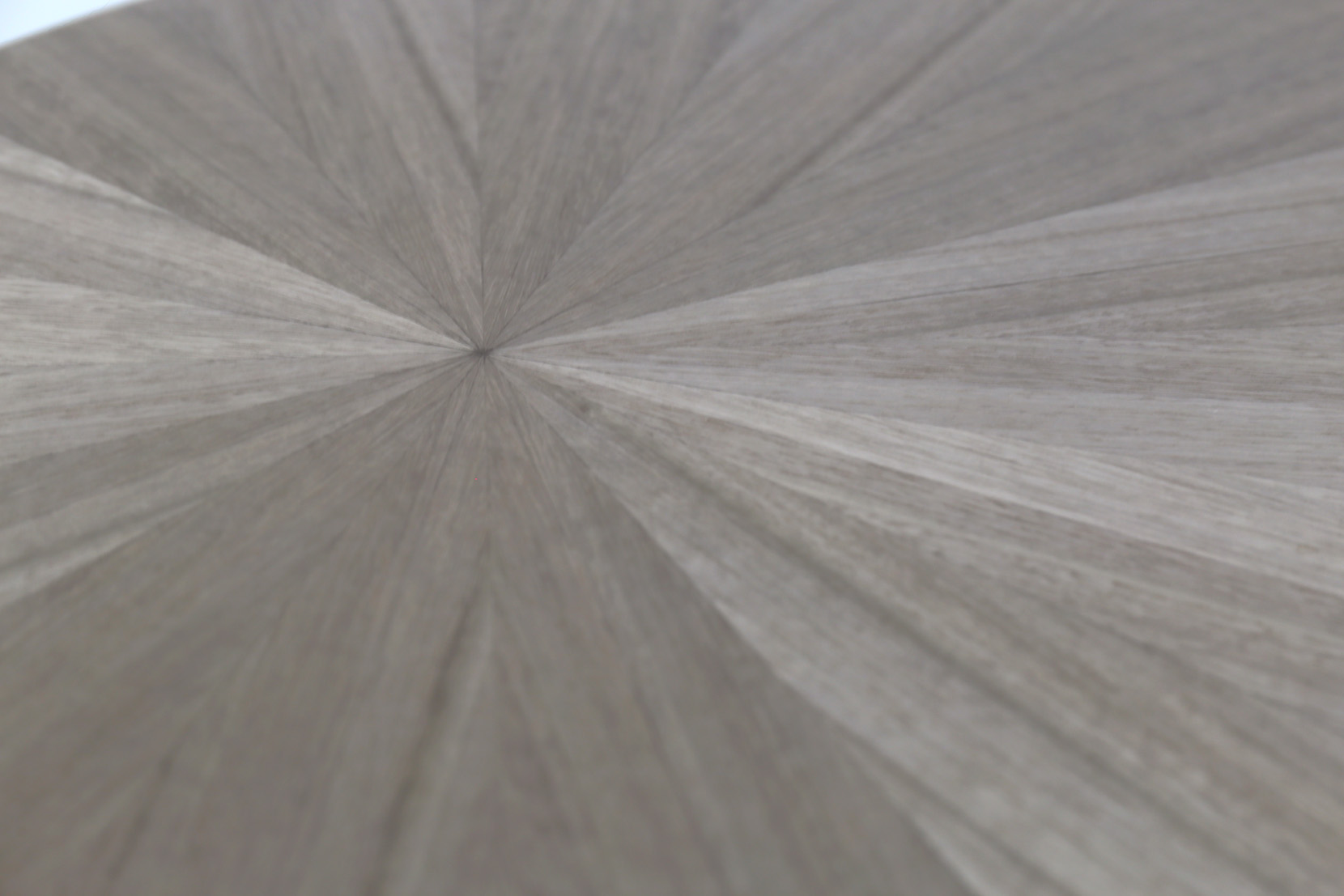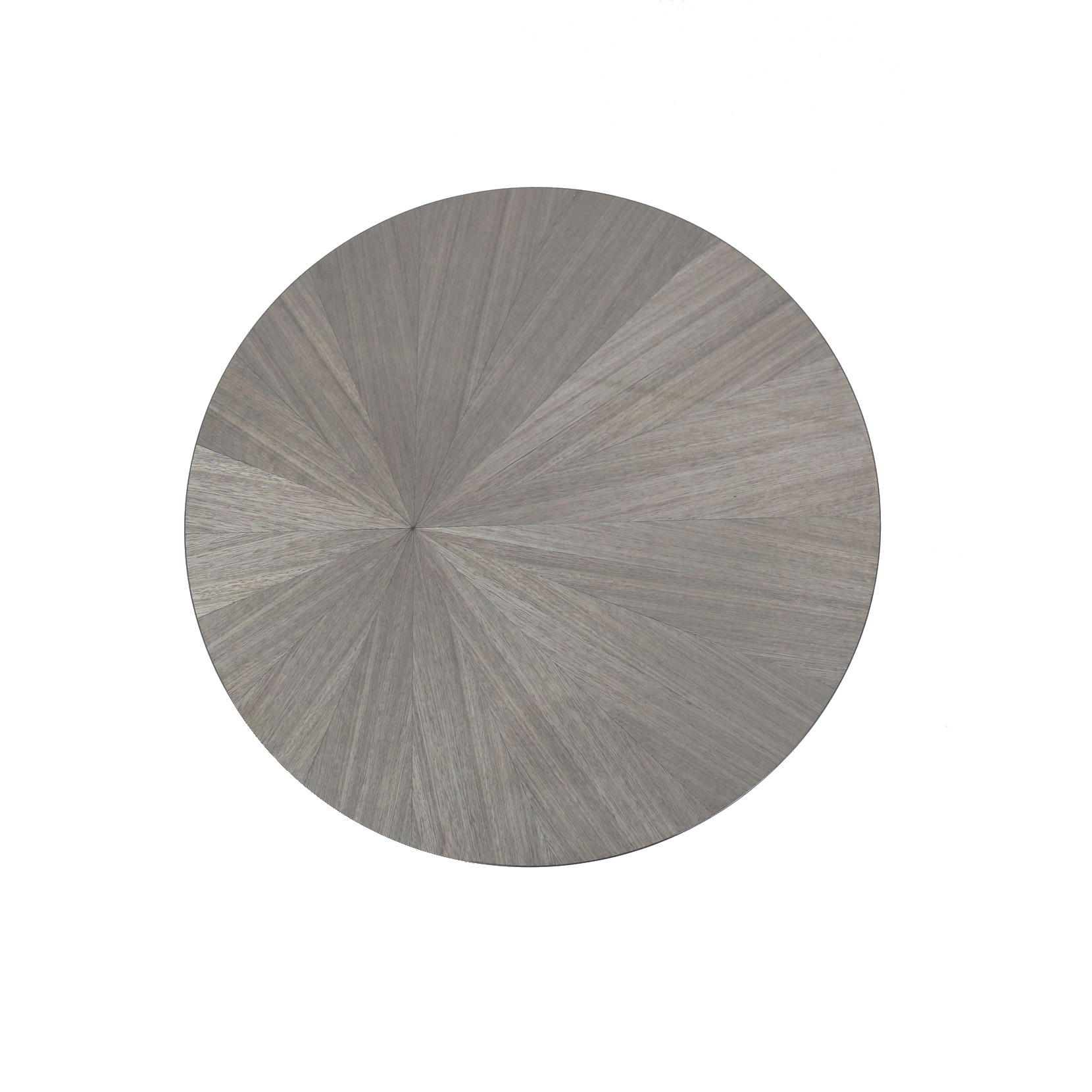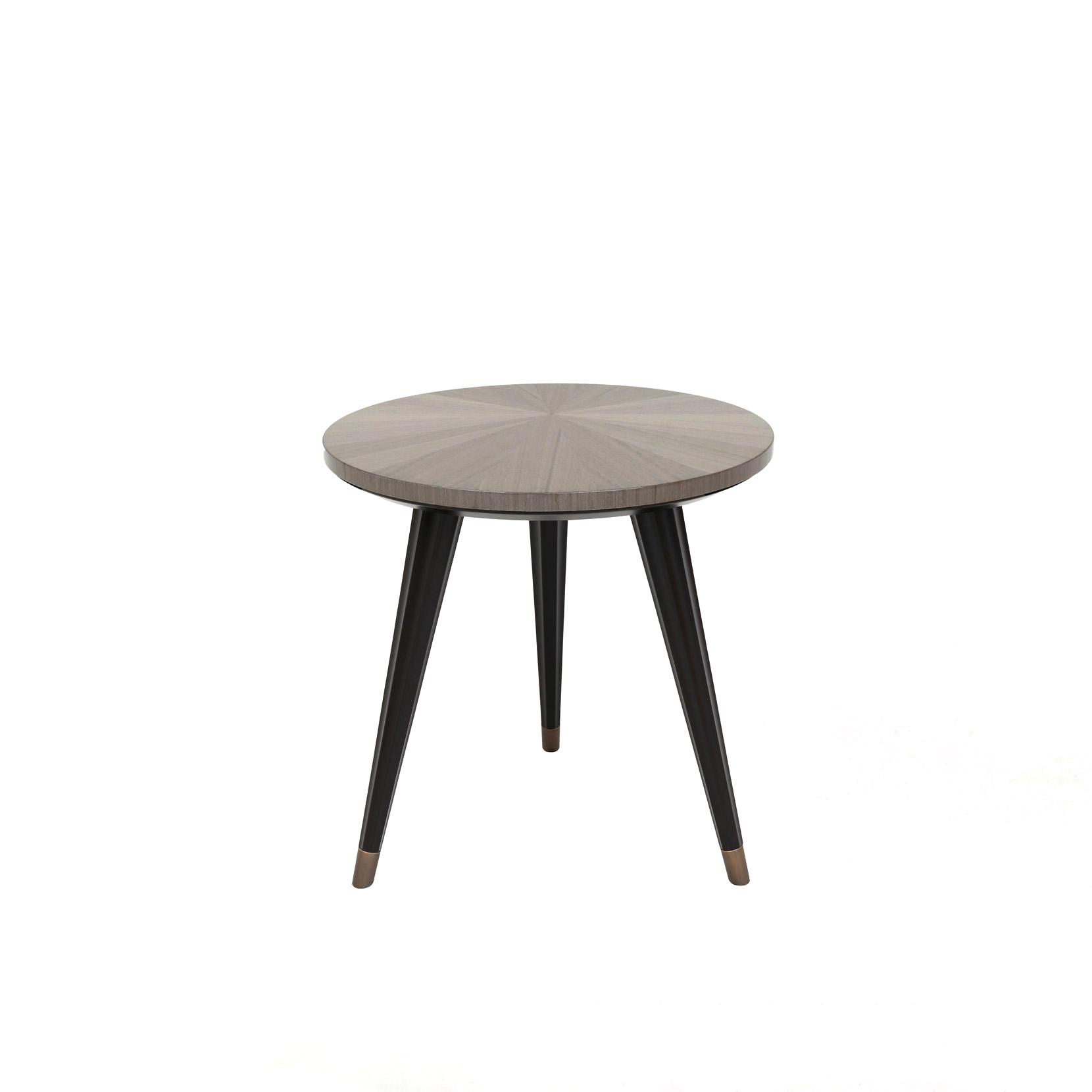 Round side table with grey eucalyptus veneer, wooden lacquered legs, metal tips.