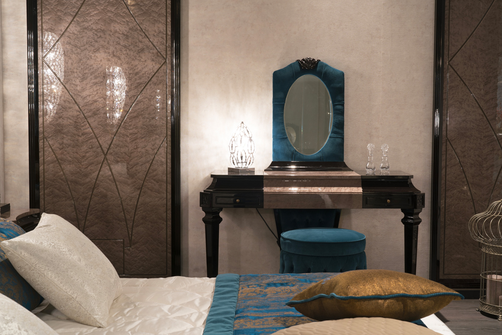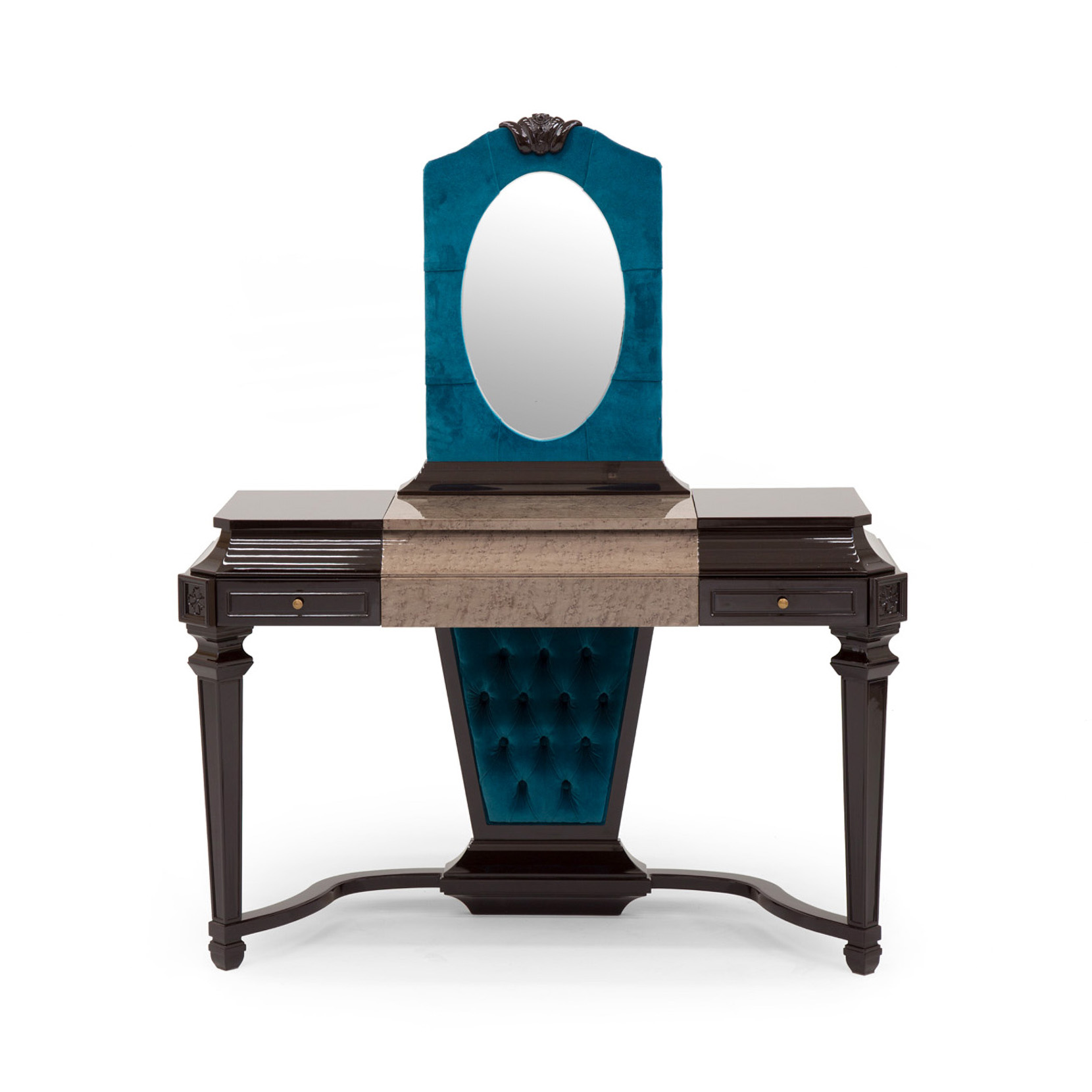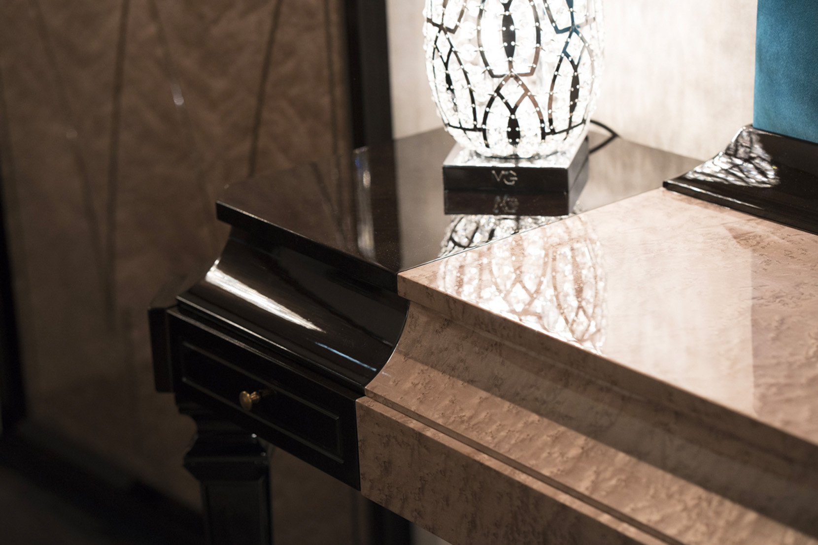 Make-up table veneered in bird's eye maple clay color and lacquered parts