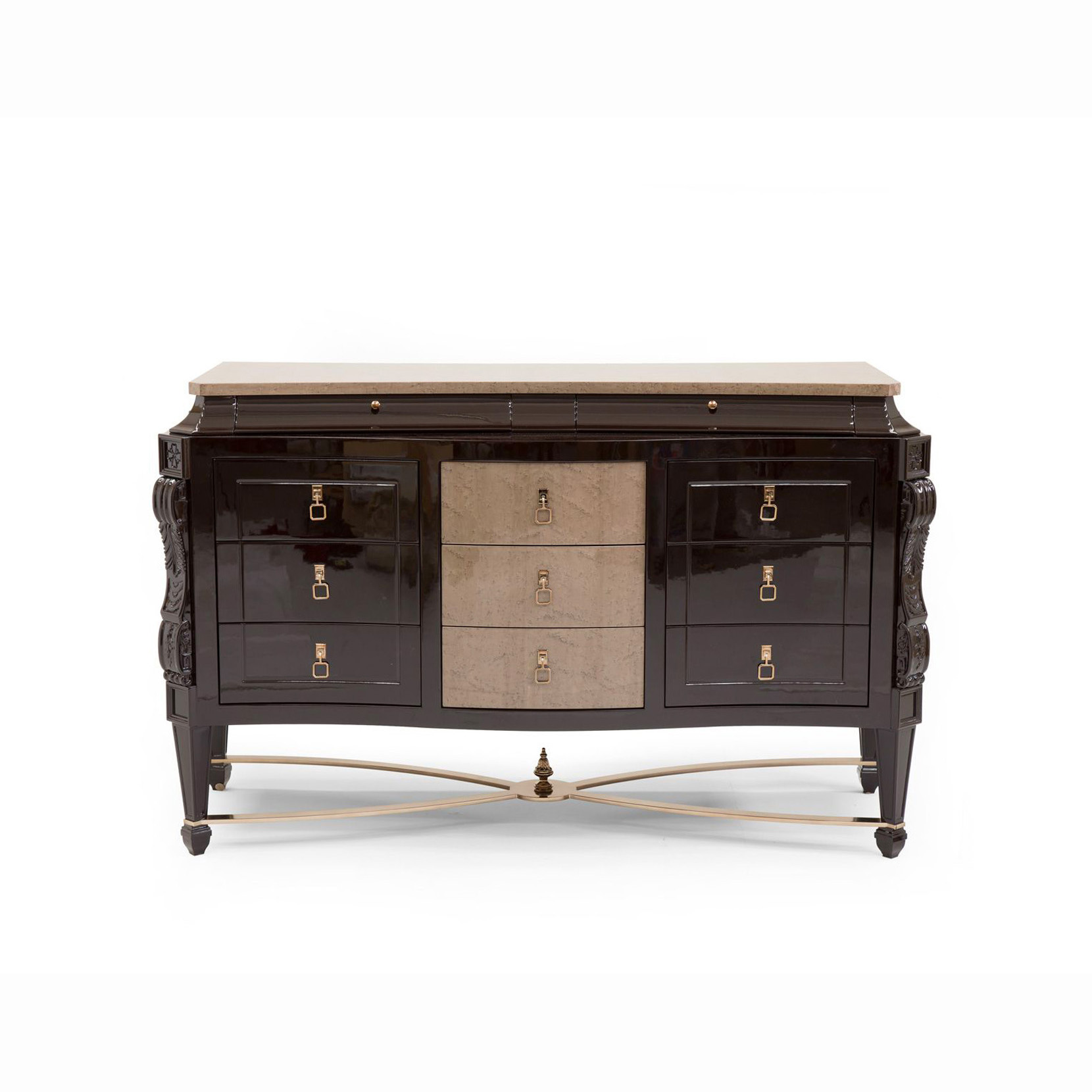 8-drawer chest veneered in bird's eye maple clay color and lacquerd parts, metal elements