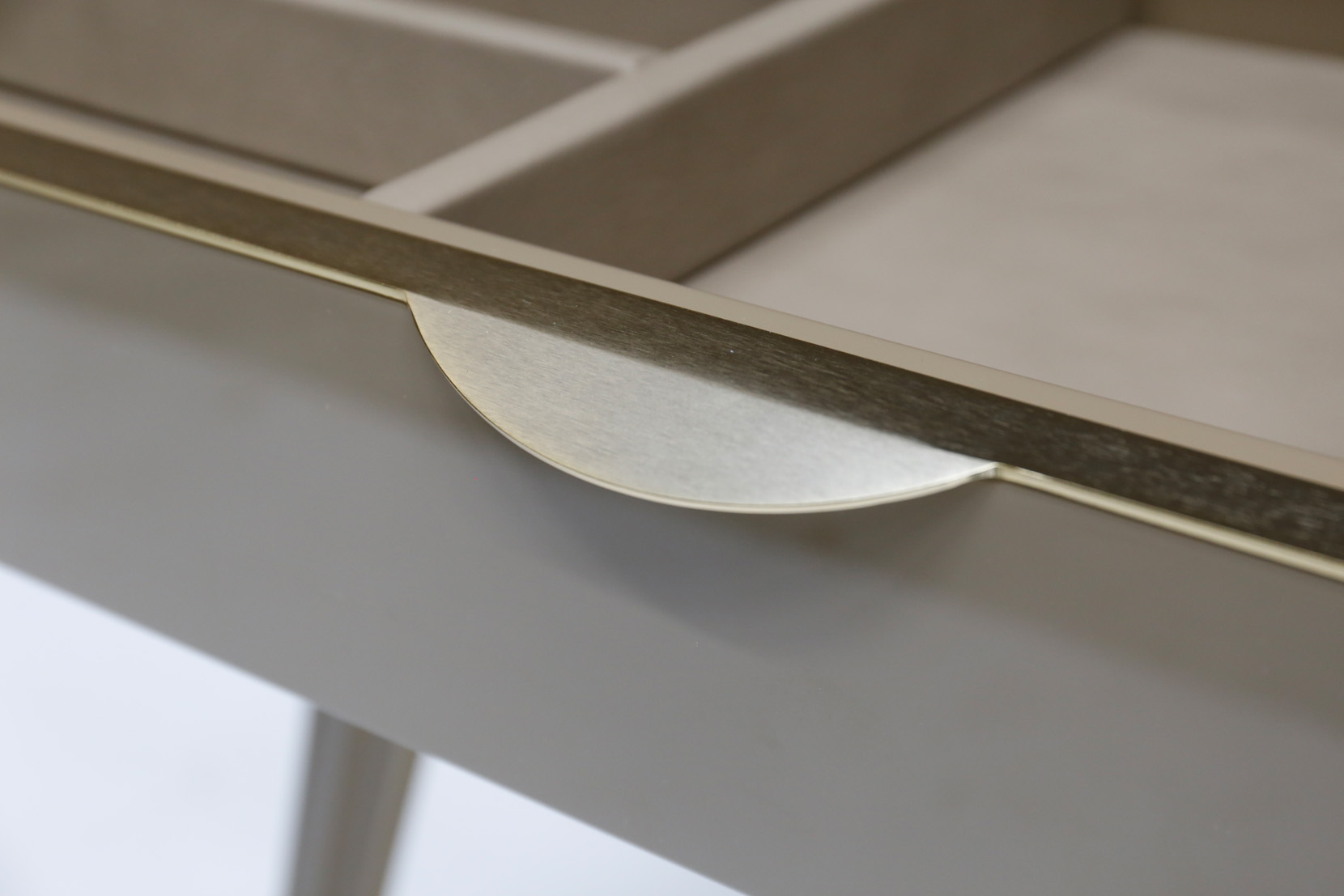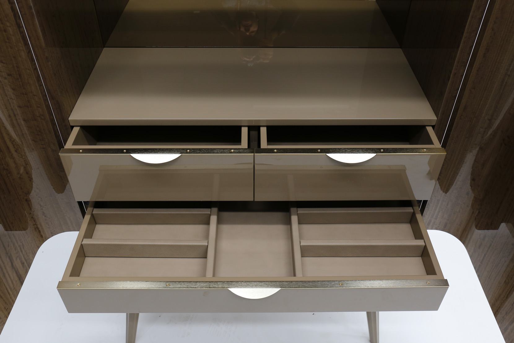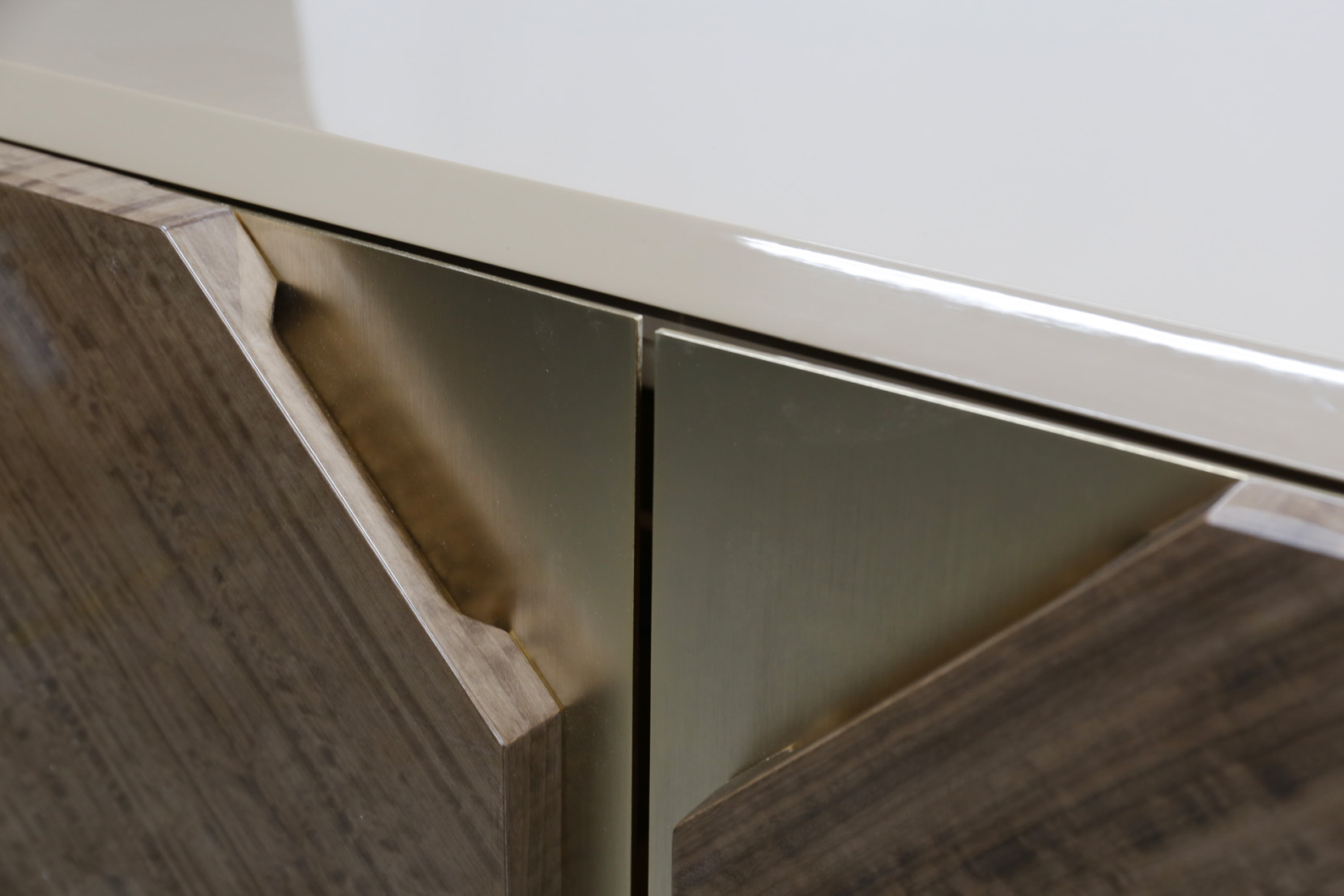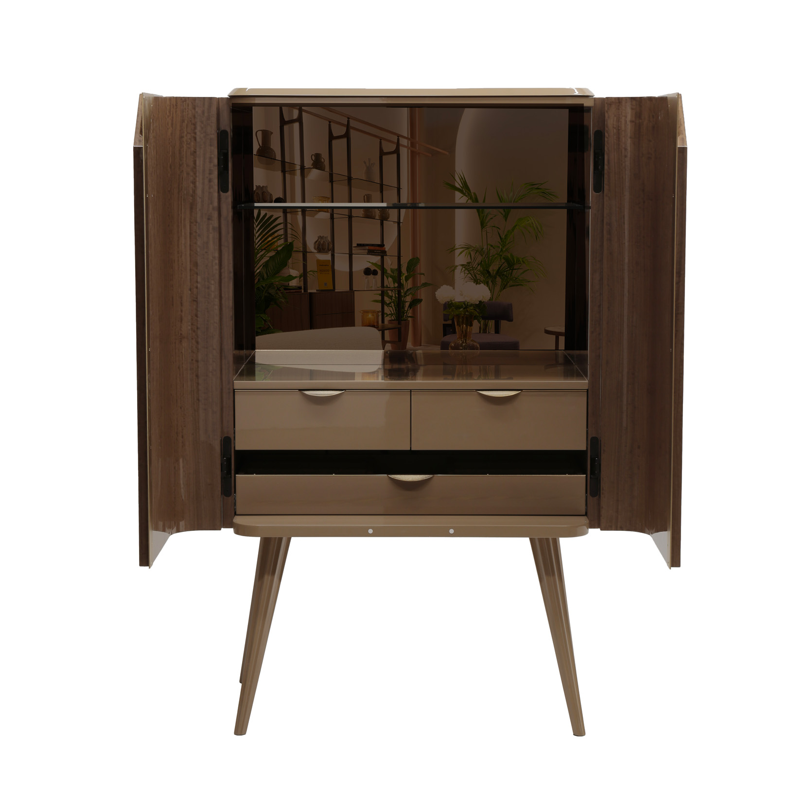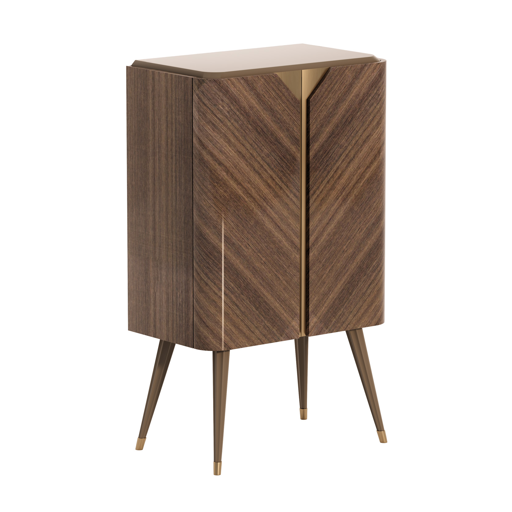 Cabinet with 2 doors and 2 glass shelves, figured eucalyptus veneer, matt lacquered parts, metal elements.