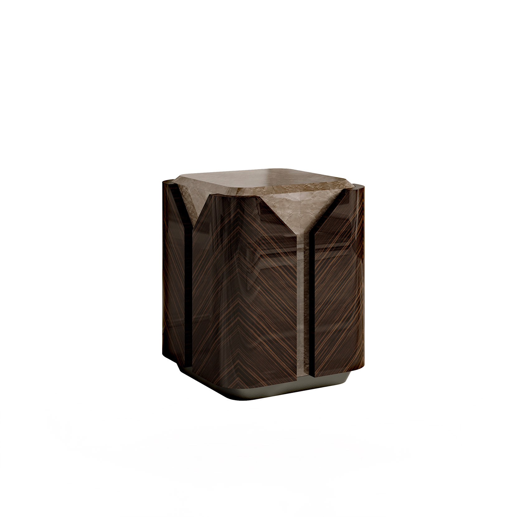 Square side table with bird's eye maple veneer in clay colour, ebony veneer corner details, matt lacquered base.