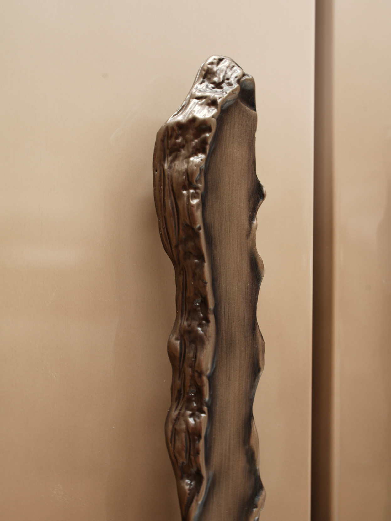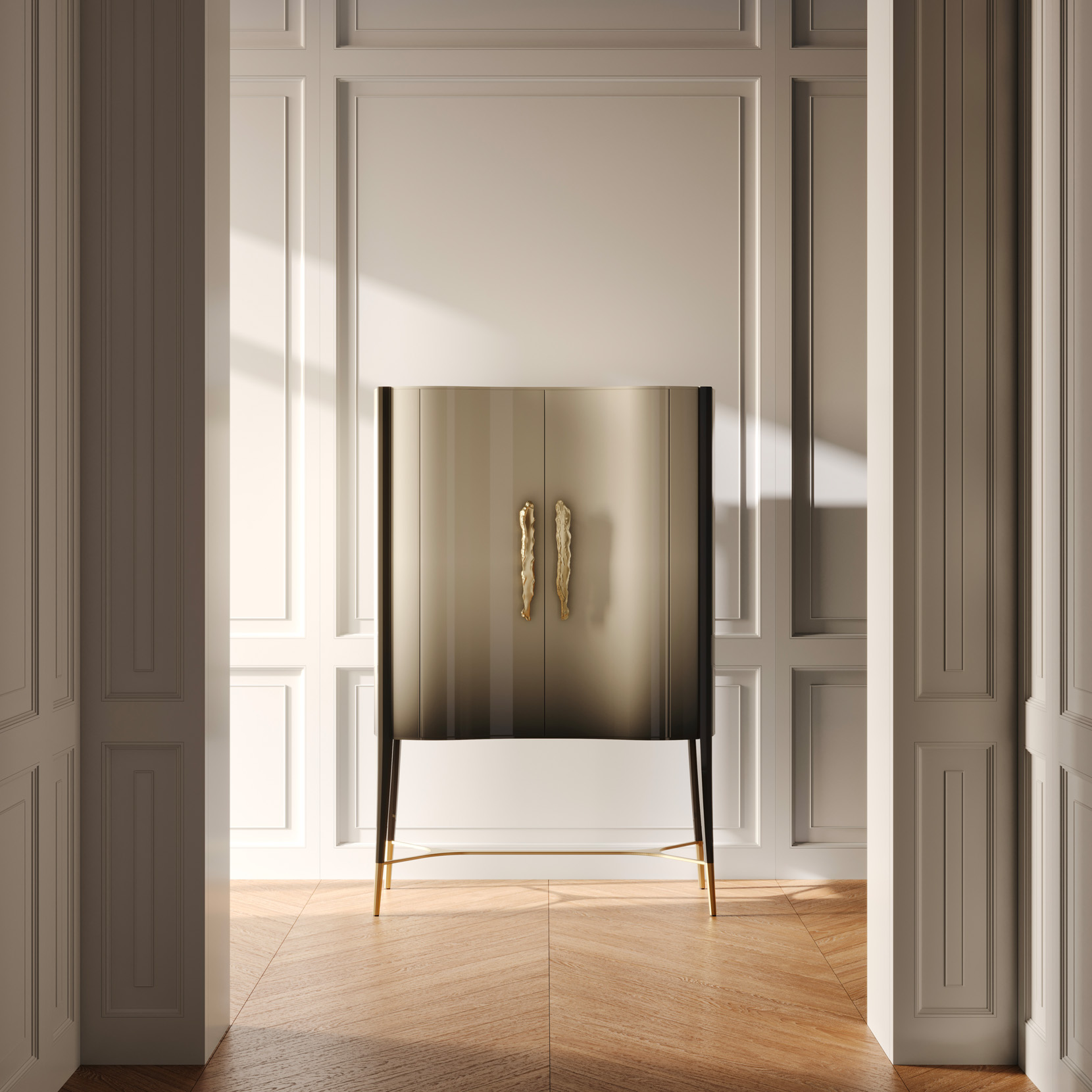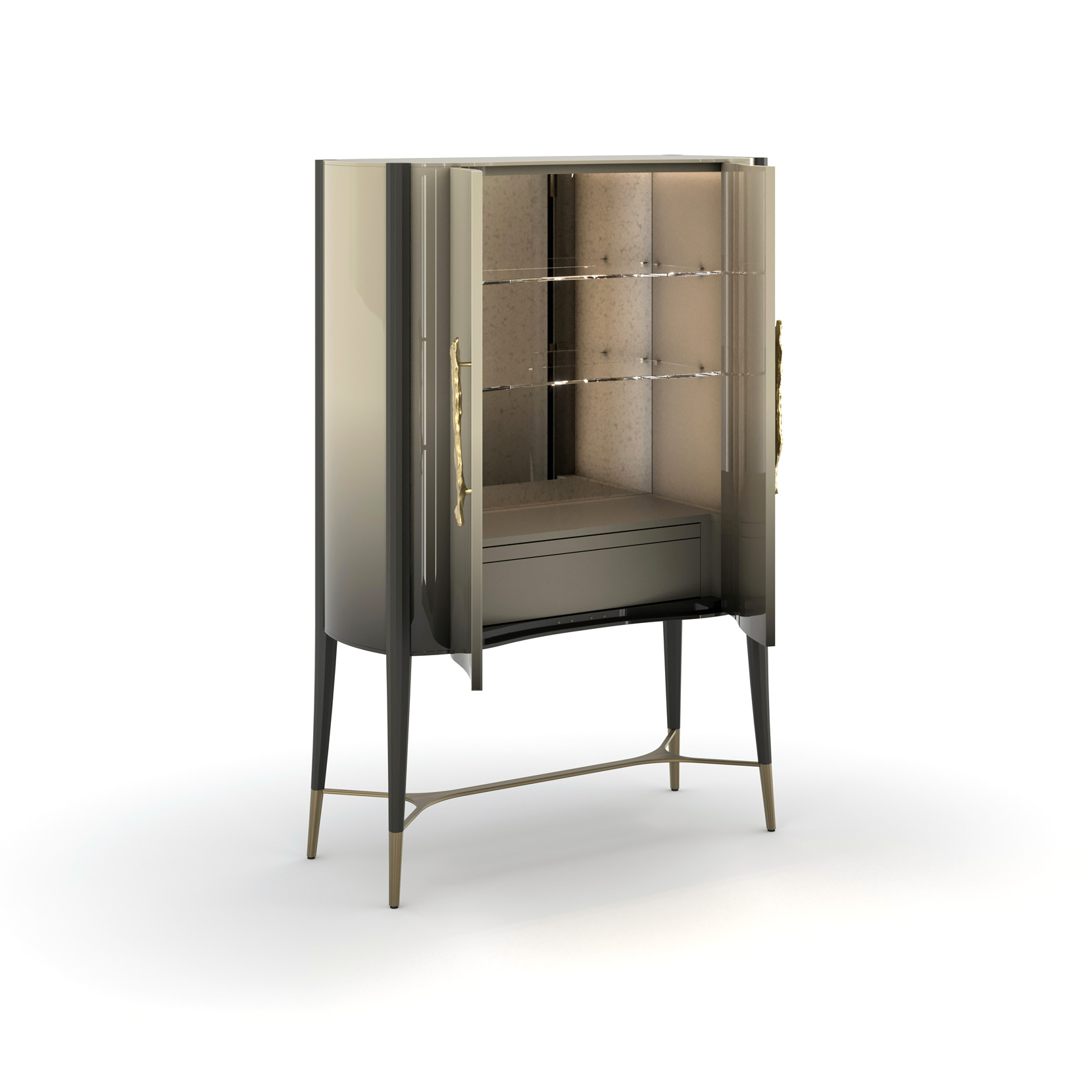 2-door bar cabinet with matt lacquered wood structure, glass shelves, metal elements, LED lighting.