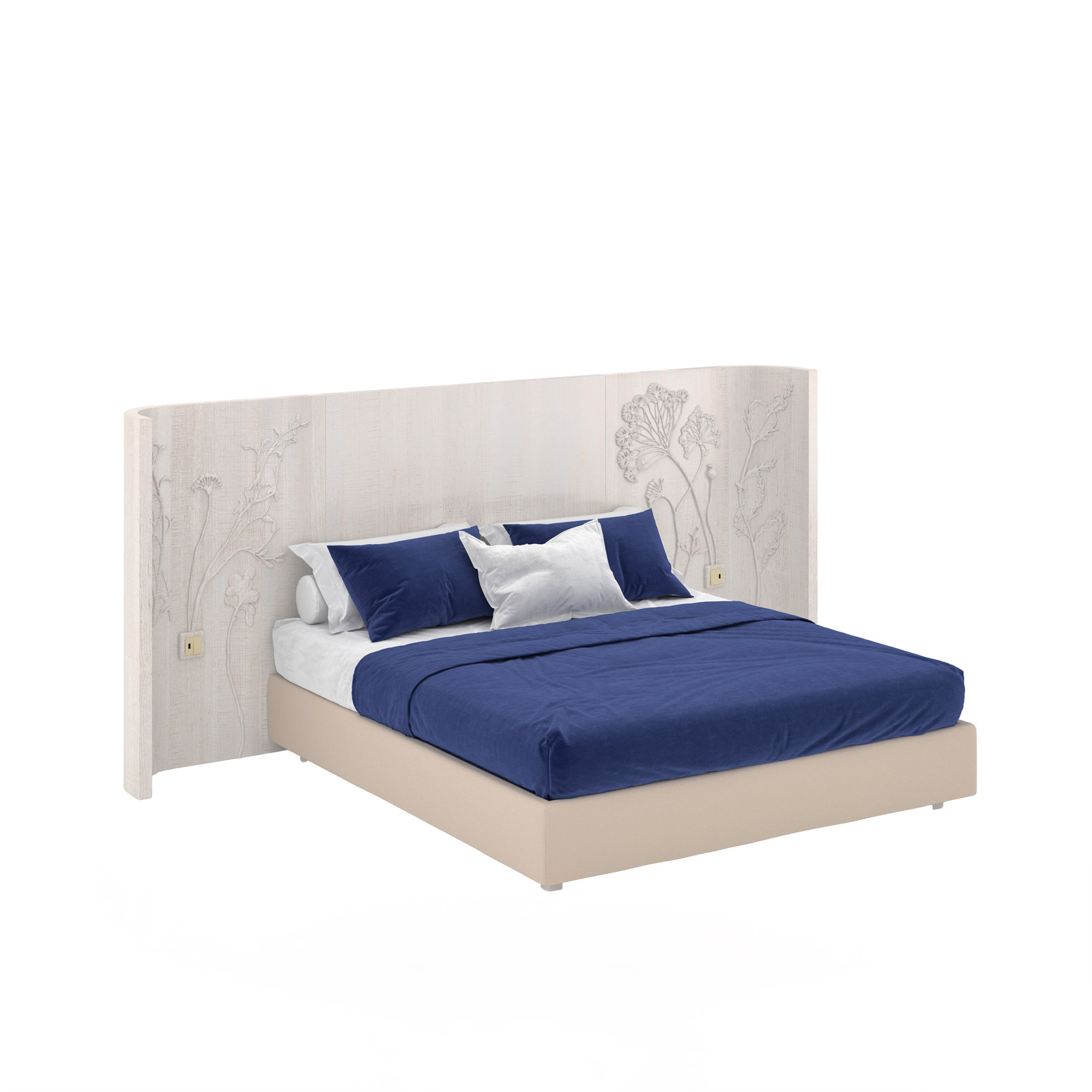 Bed with whitened maple veneer, C.O.M. upholstered bed base.