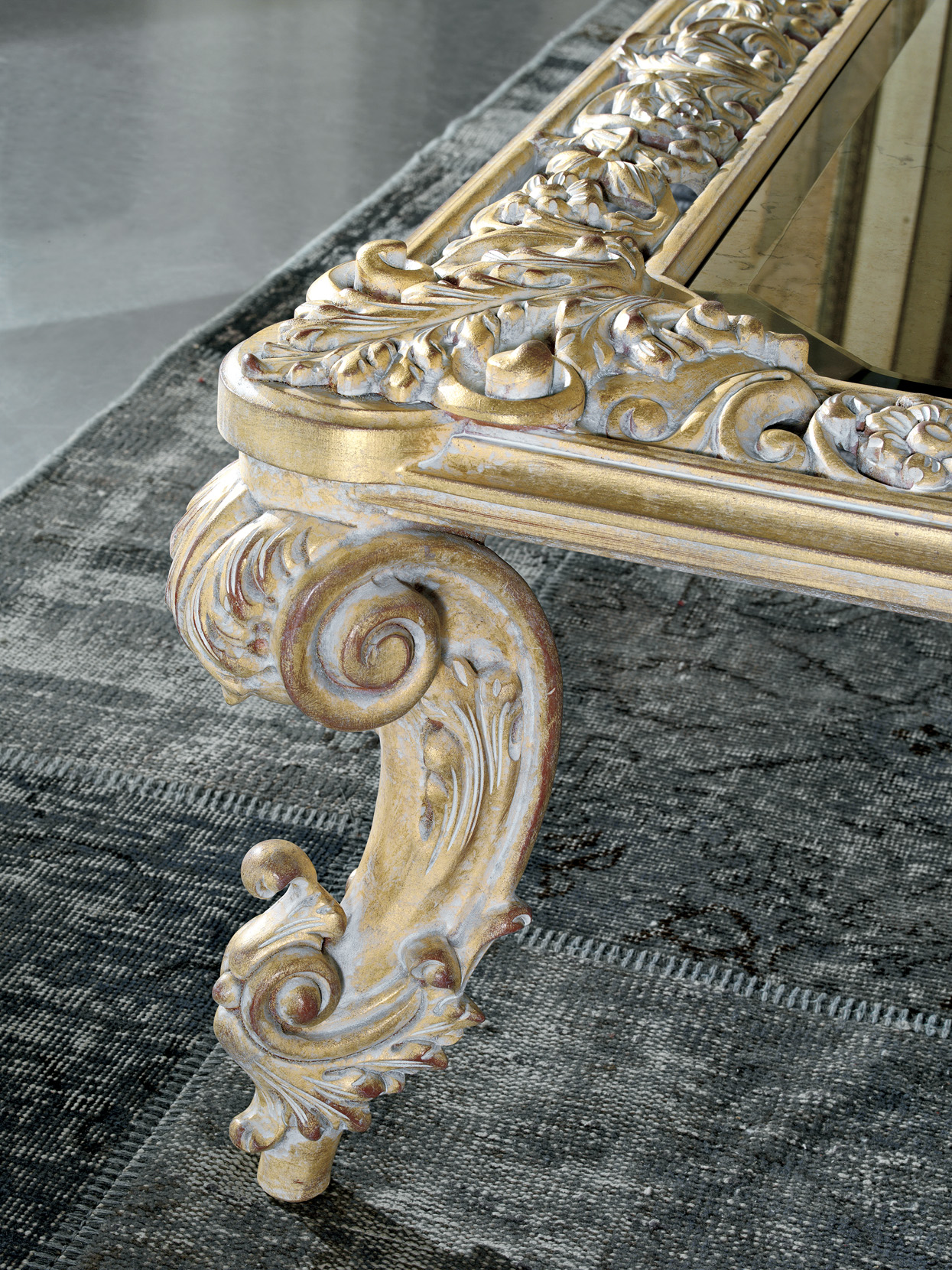Coffee table in solid carved wood and antique mirror top