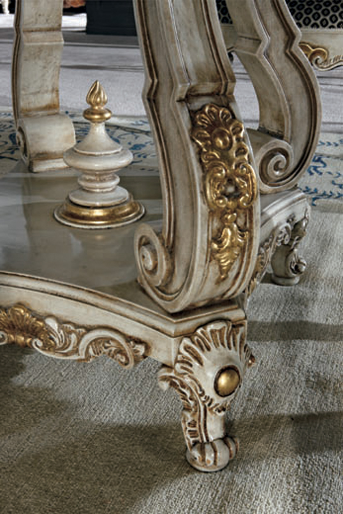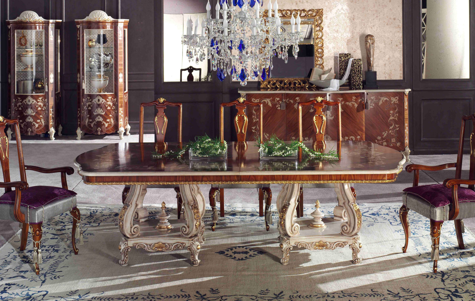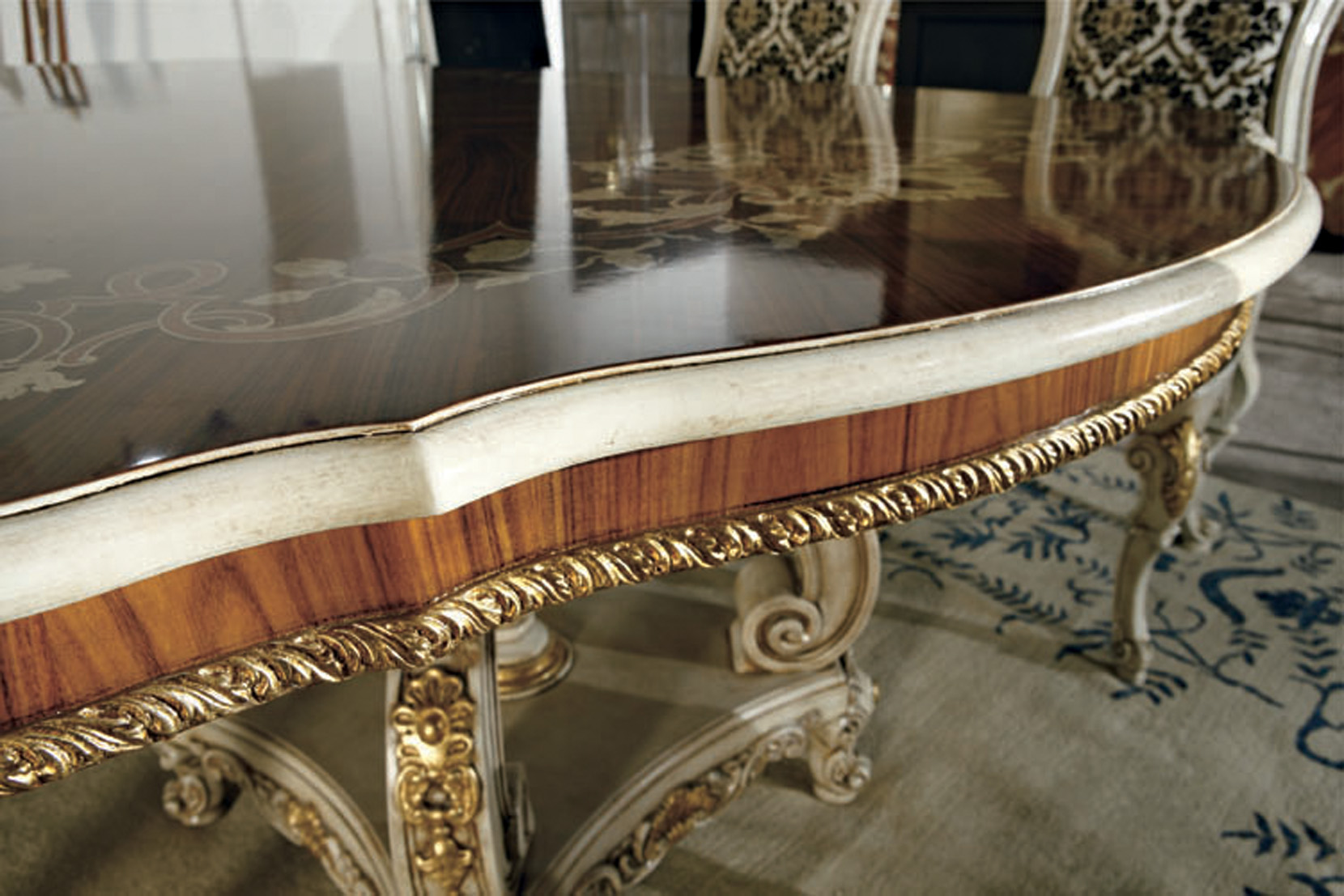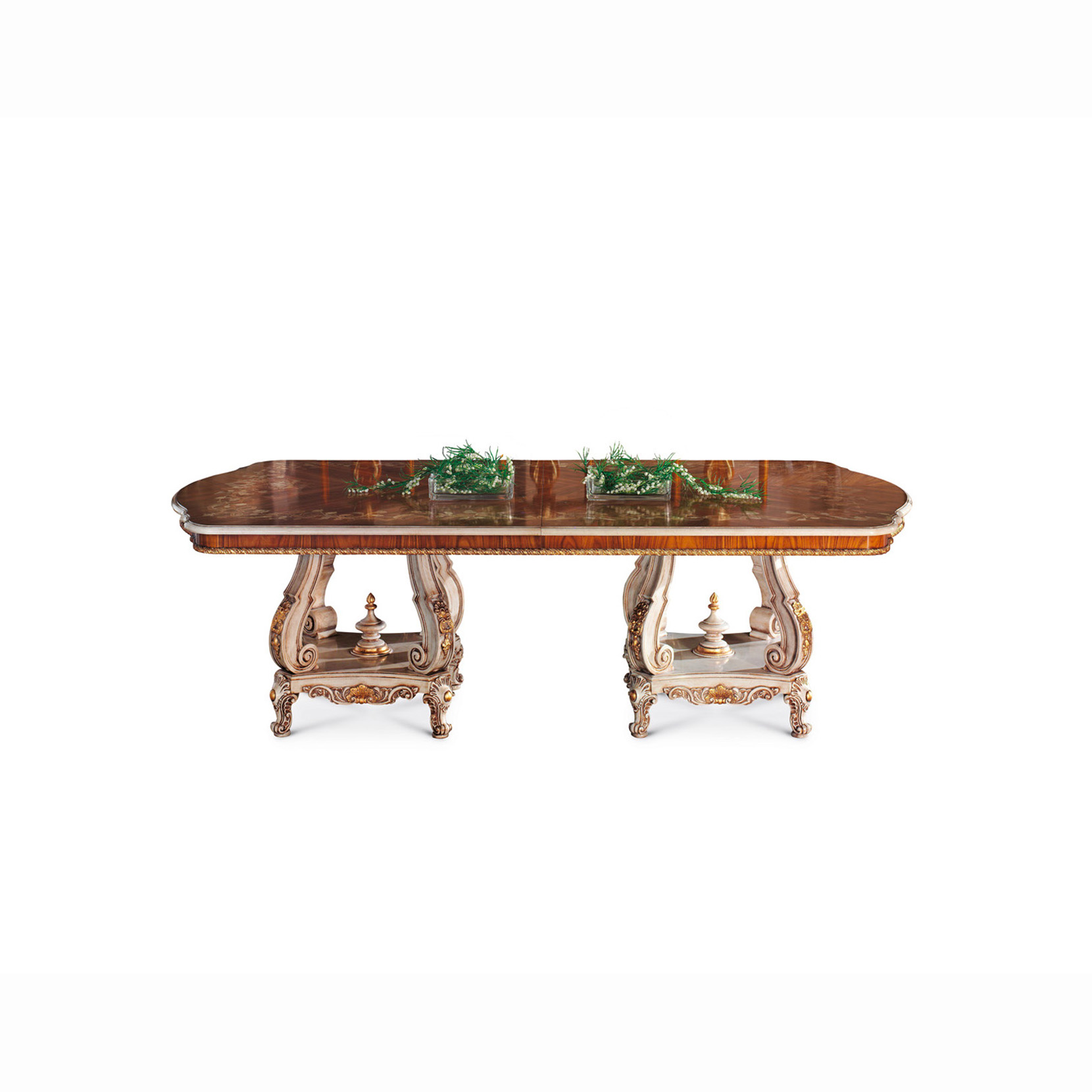 Fixed table with pedestals, top veneered in rosewood Santos, amaranth, mother of pearl and maple