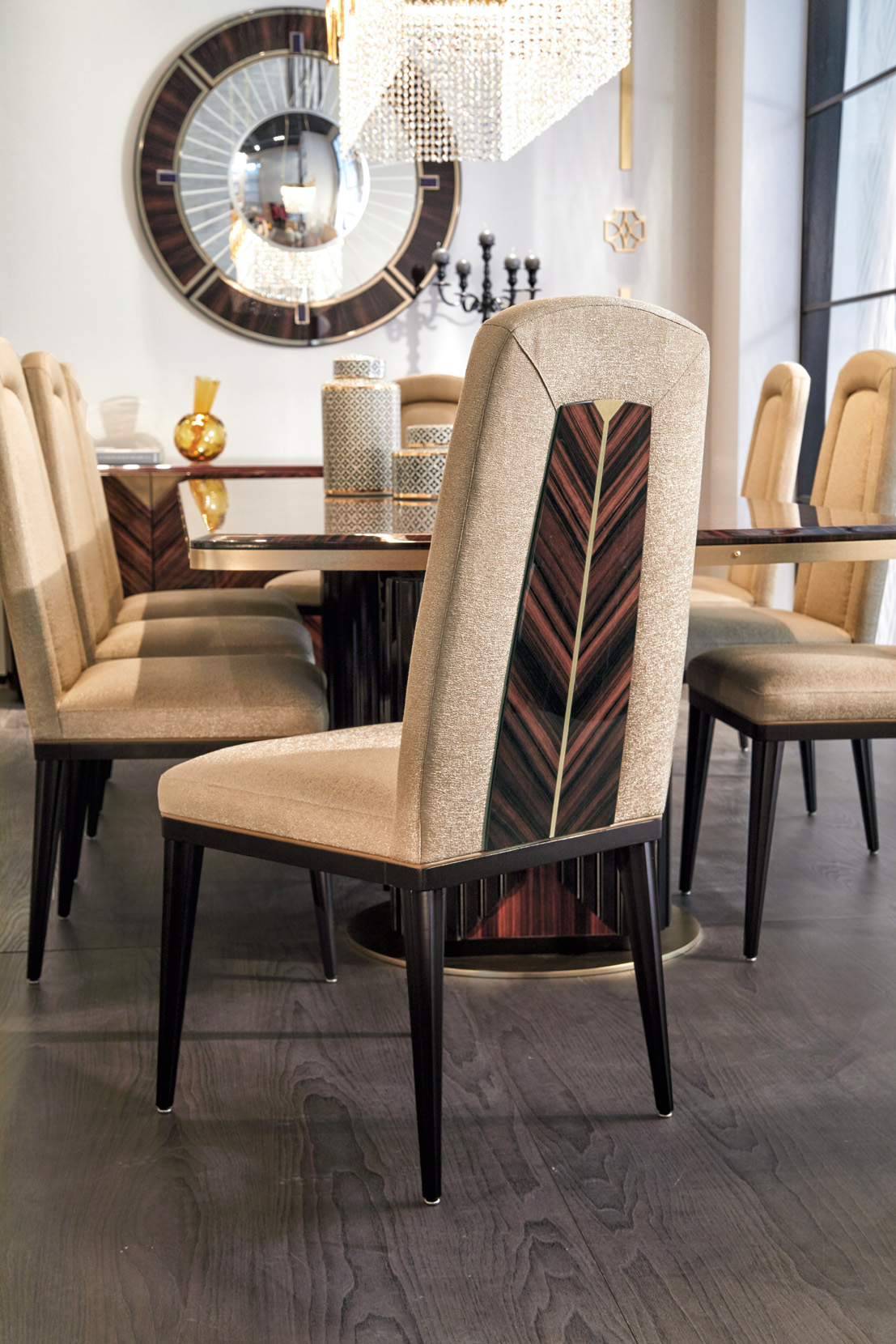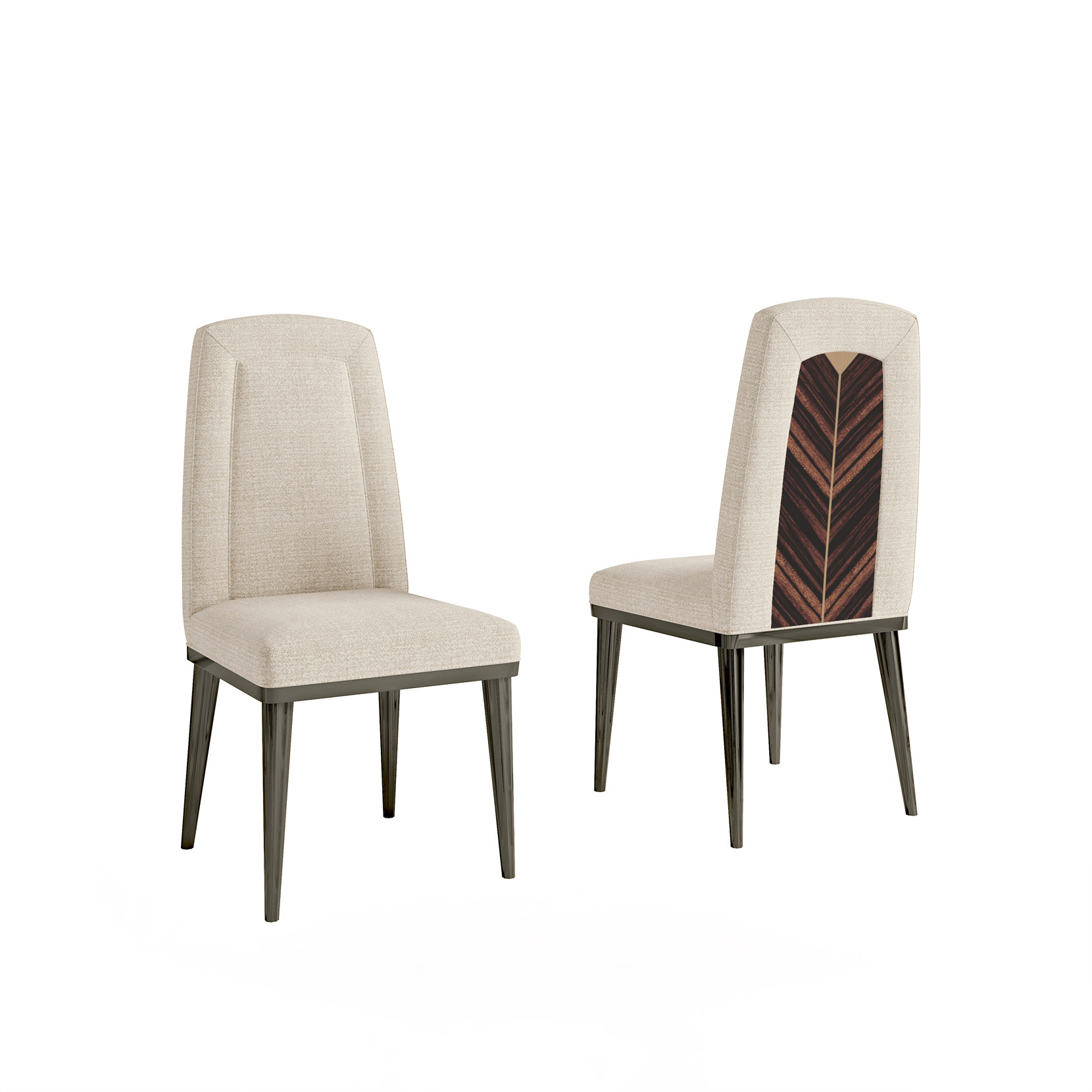 Chair with ebony veneer backrest, matt lacquered legs, fabric upholstery.