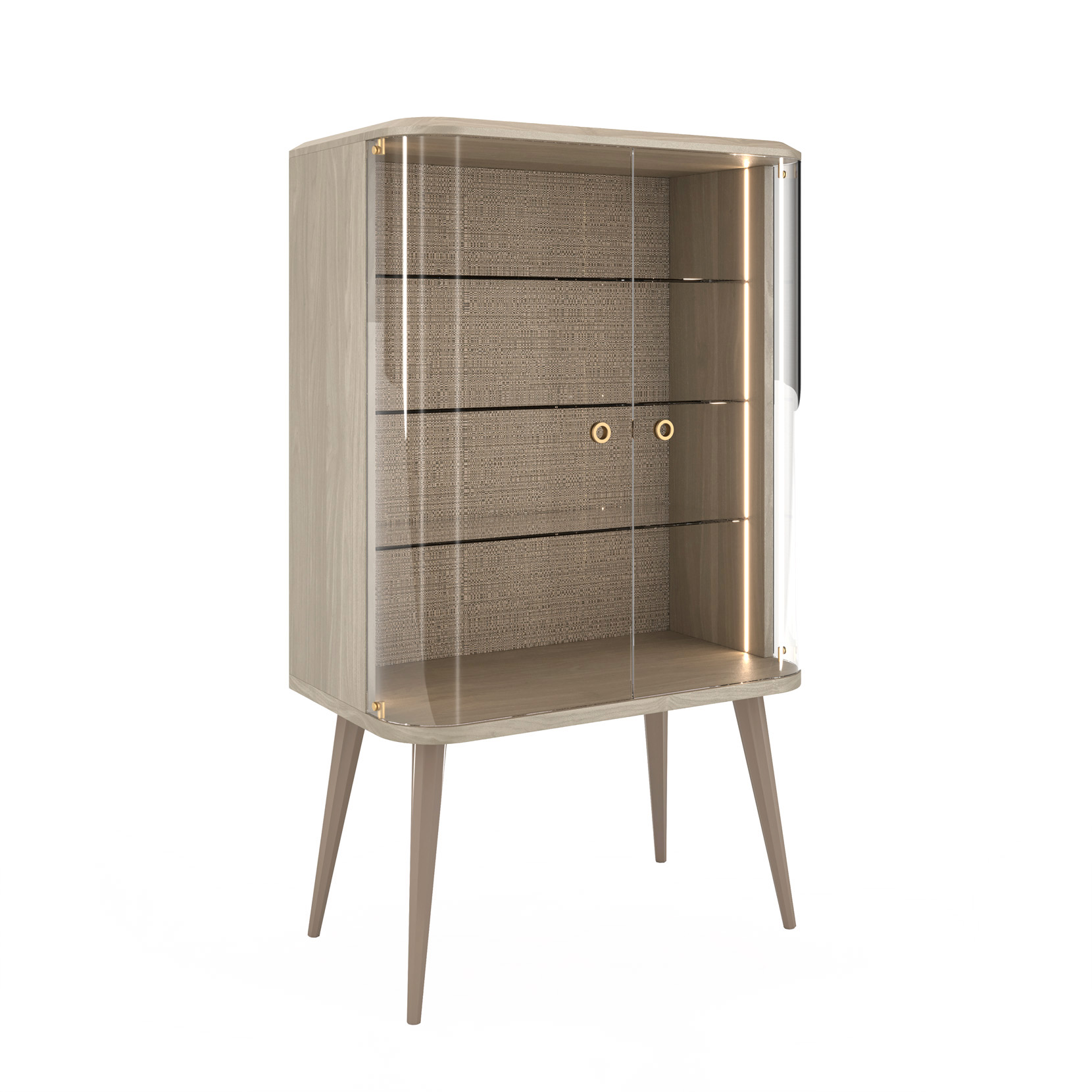 2-door showcase with grey american walnut veneer, lacquered legs, glass shelves, LED lighting.