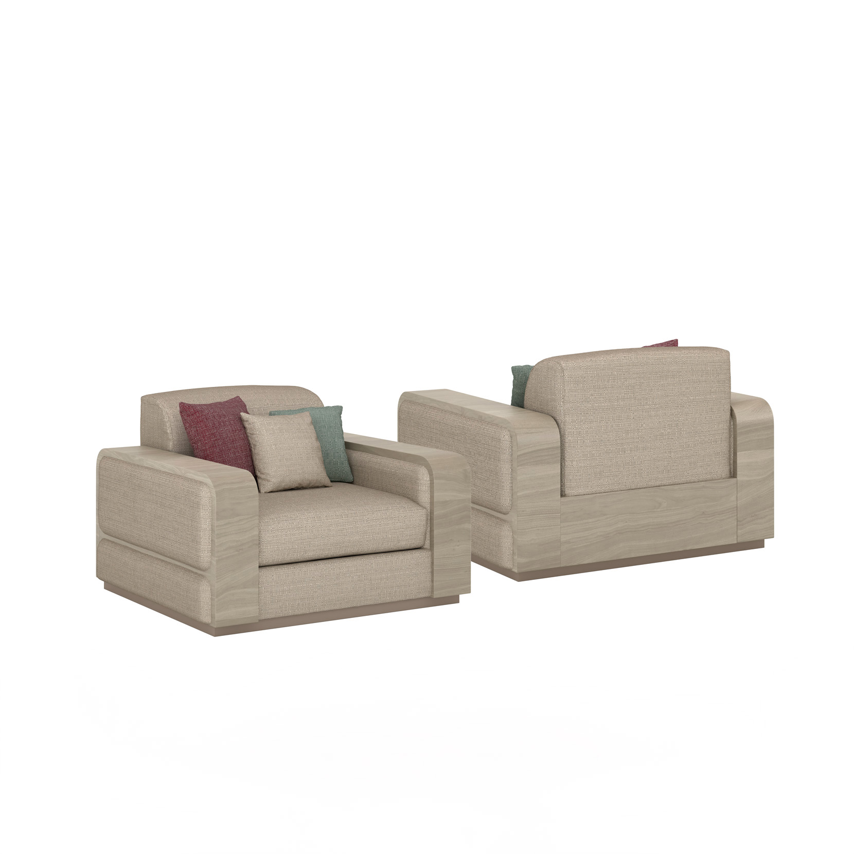 Armchair with grey American walnut veneer, matt lacquered parts, fabric upholstery.