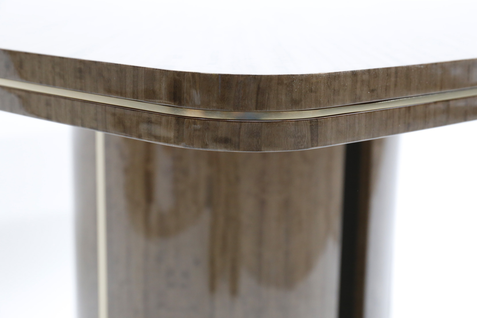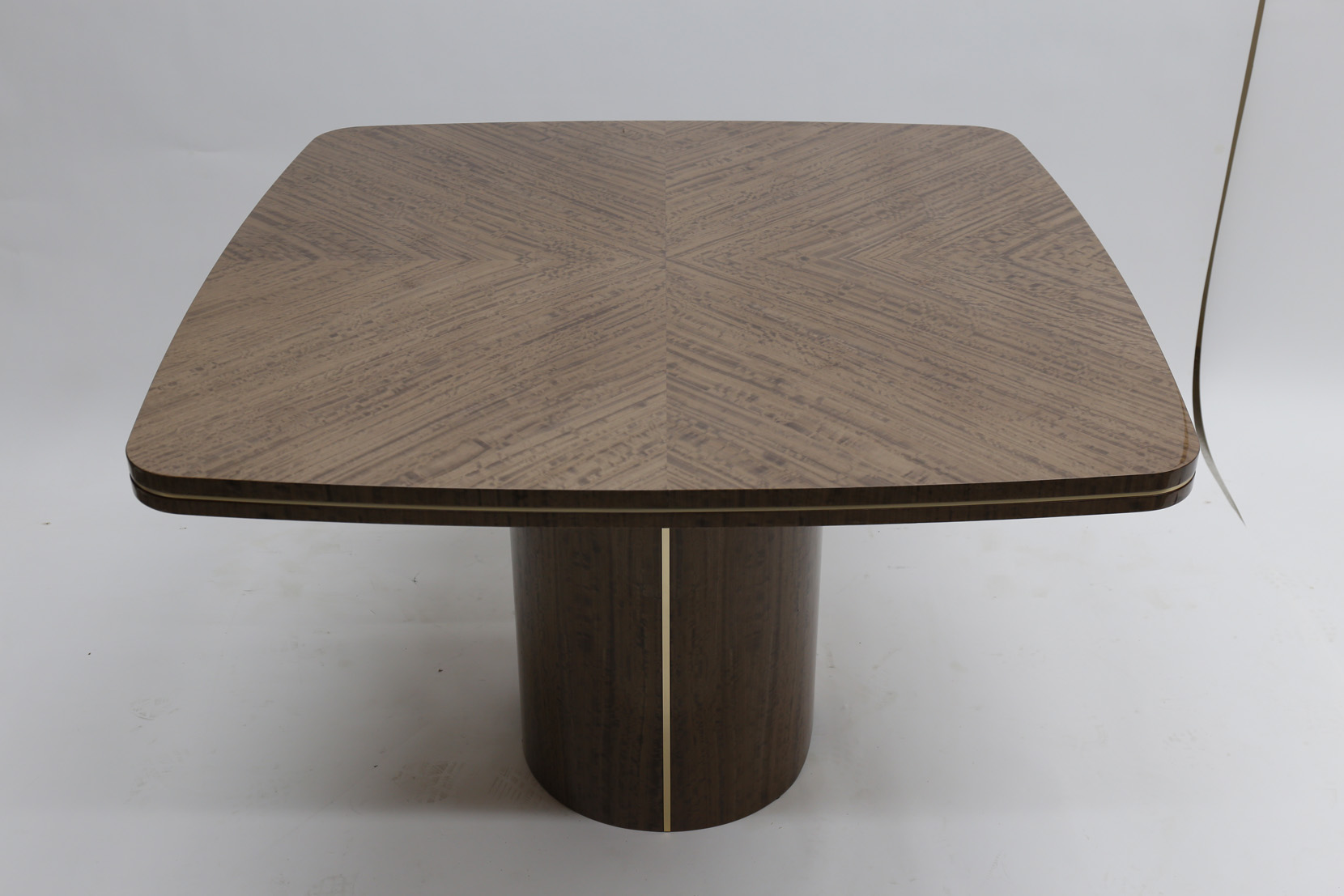 Square fixed table with matt eucalyptus veneer in taupe colour, metal stripe on pedestal.