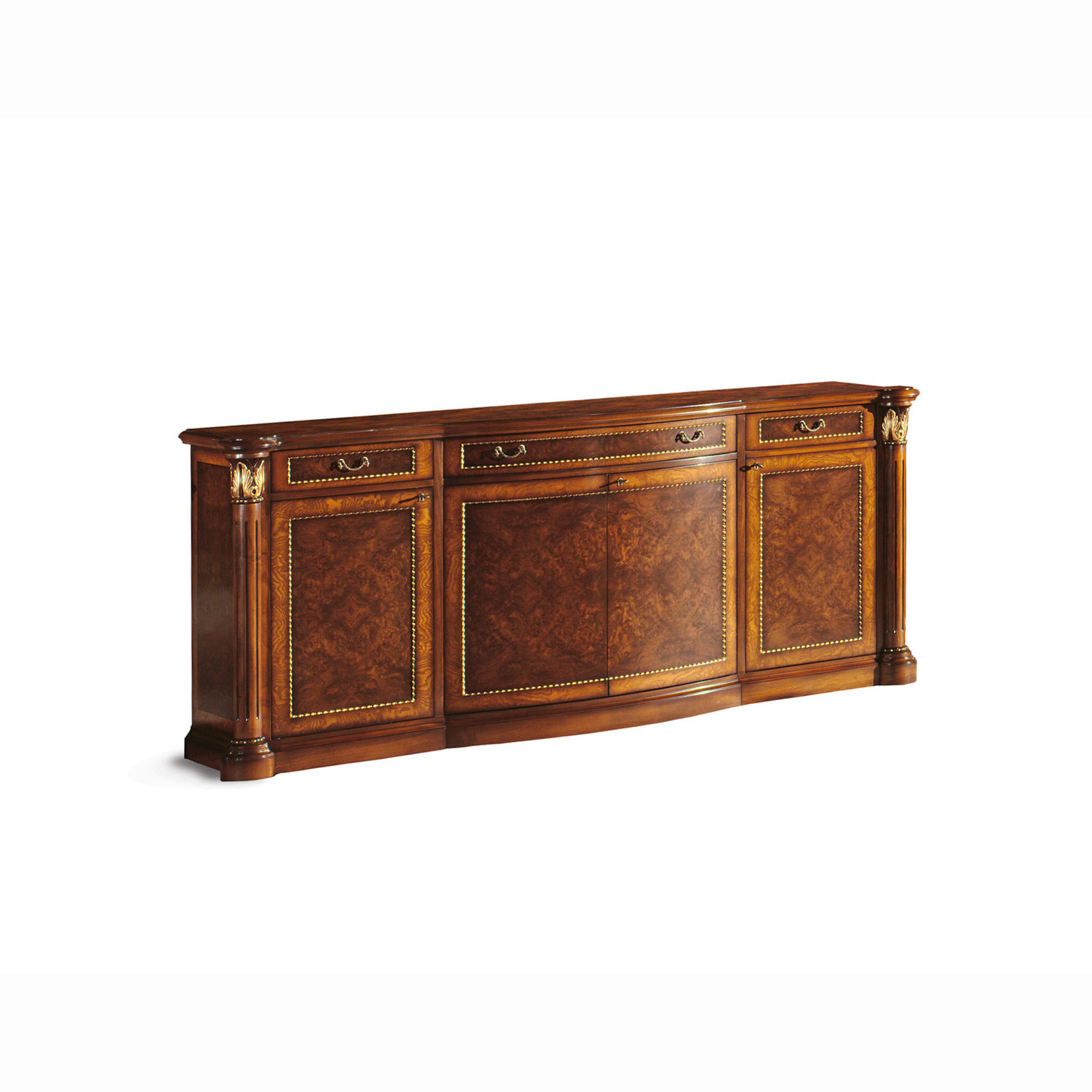 Sideboard with 4 doors and 3 drawers, veneered in walnut burl and ash burl, gold leaf details