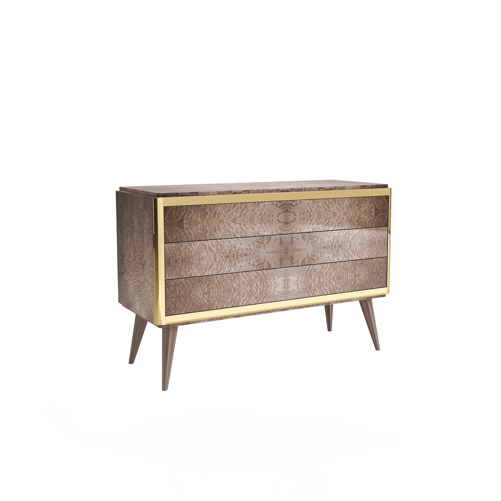 3-drawer chest with bird's eye maple veneer in clay colour, matt lacquere legs, metal elements in shiny light gold finish.