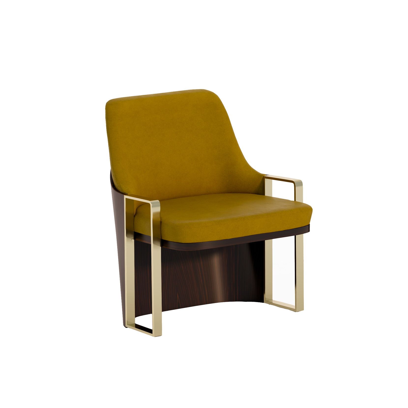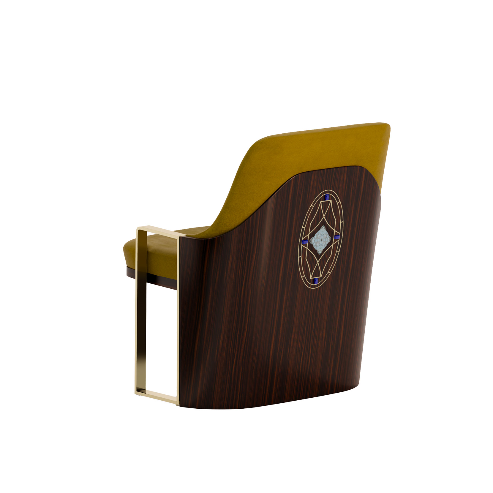 Armchair with ebony veneer, fabric upholstery, metal elements.