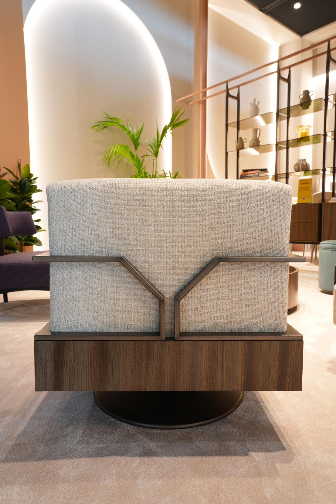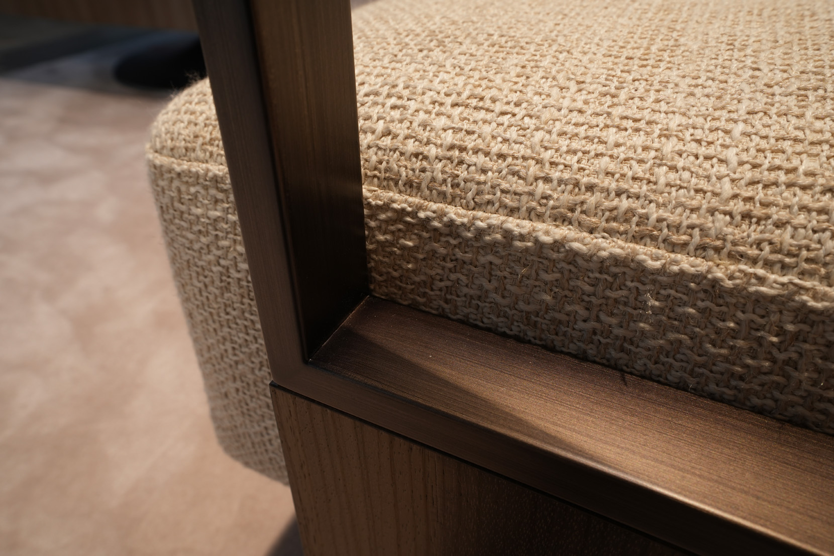 Armchair with zebrano veneer in suede colour, fabric upholstery, metal elements.