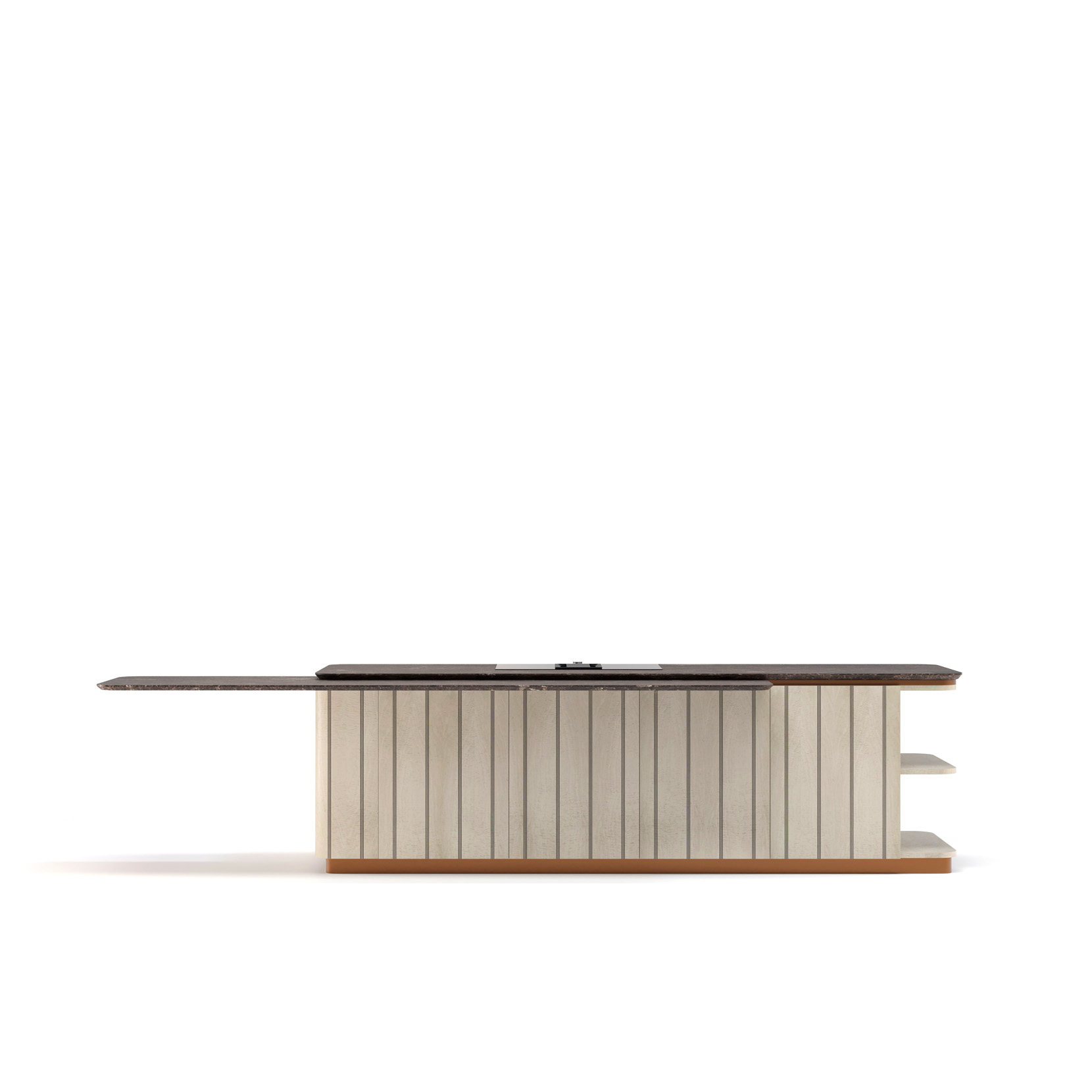 Kitchen island with figured maple veneer in pearl grey colour, anthracite eucalyptus inlay stripes, metal elements in copper finish, smoked glass.