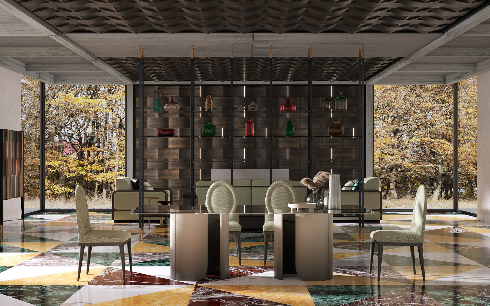Rectangular fixed table in beveled glass top, matt gradient-lacquered pedestals, metal elements.