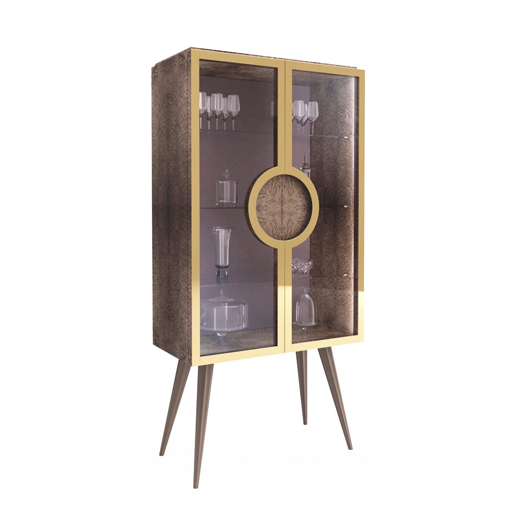 2-door showcase with bird's eye maple veneer in clay colour, matt lacquered parts, glass shelves, metal elements, LED lighting.