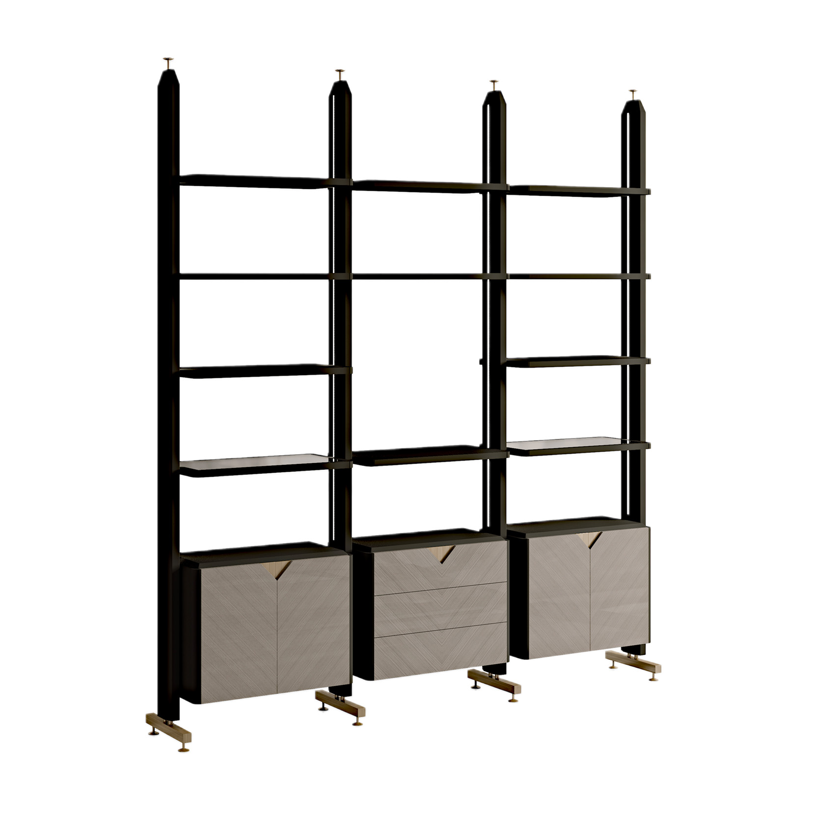 Modular double-sided bookcase with ceiling mounting system, grey eucalyptus veneer, lacquered parts, metal elements.