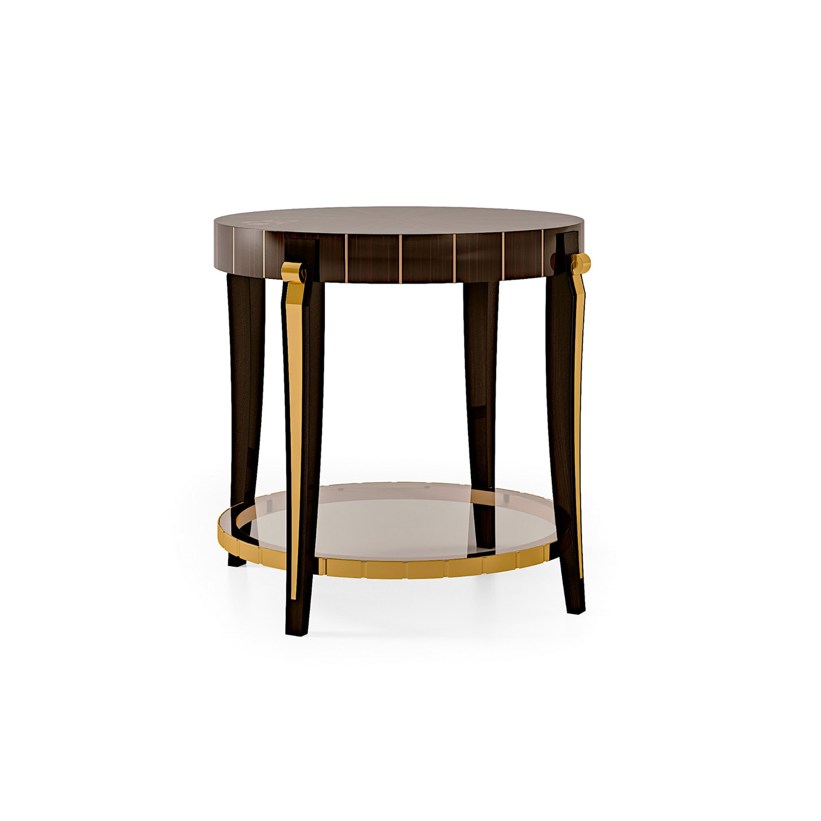 Round side table, top veneered in Macassar ebony, mother of pearl, brass, metal elements