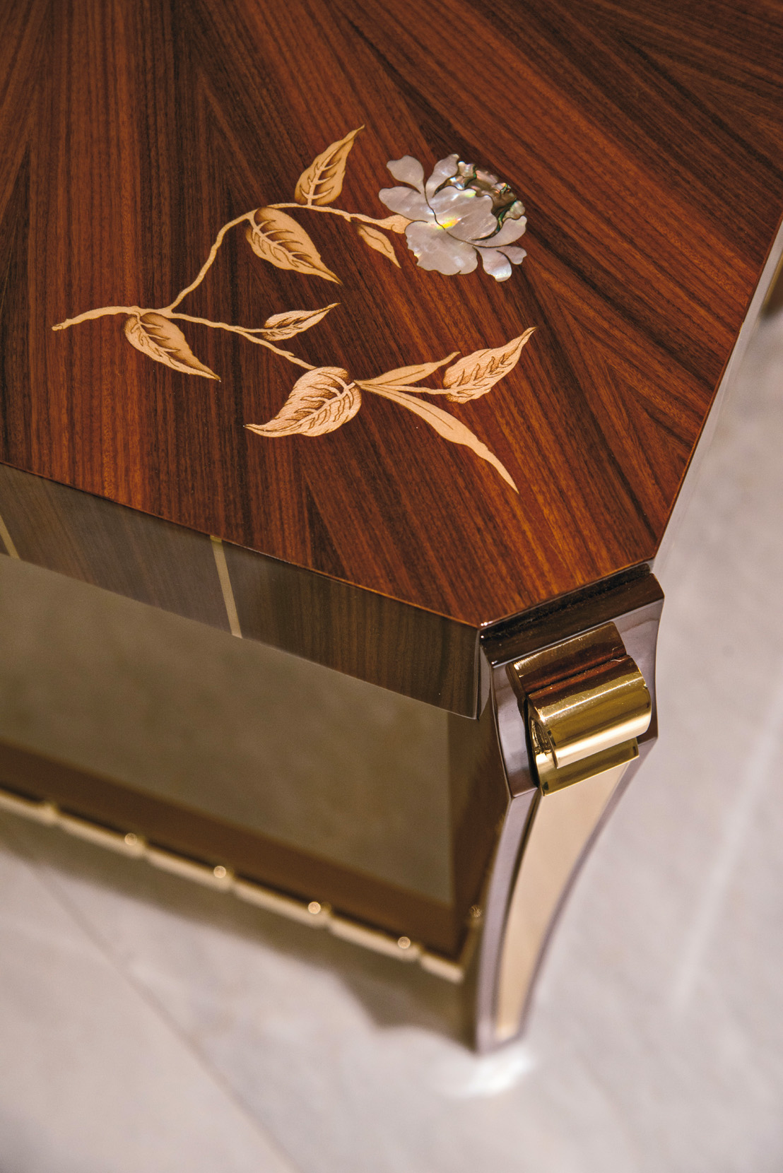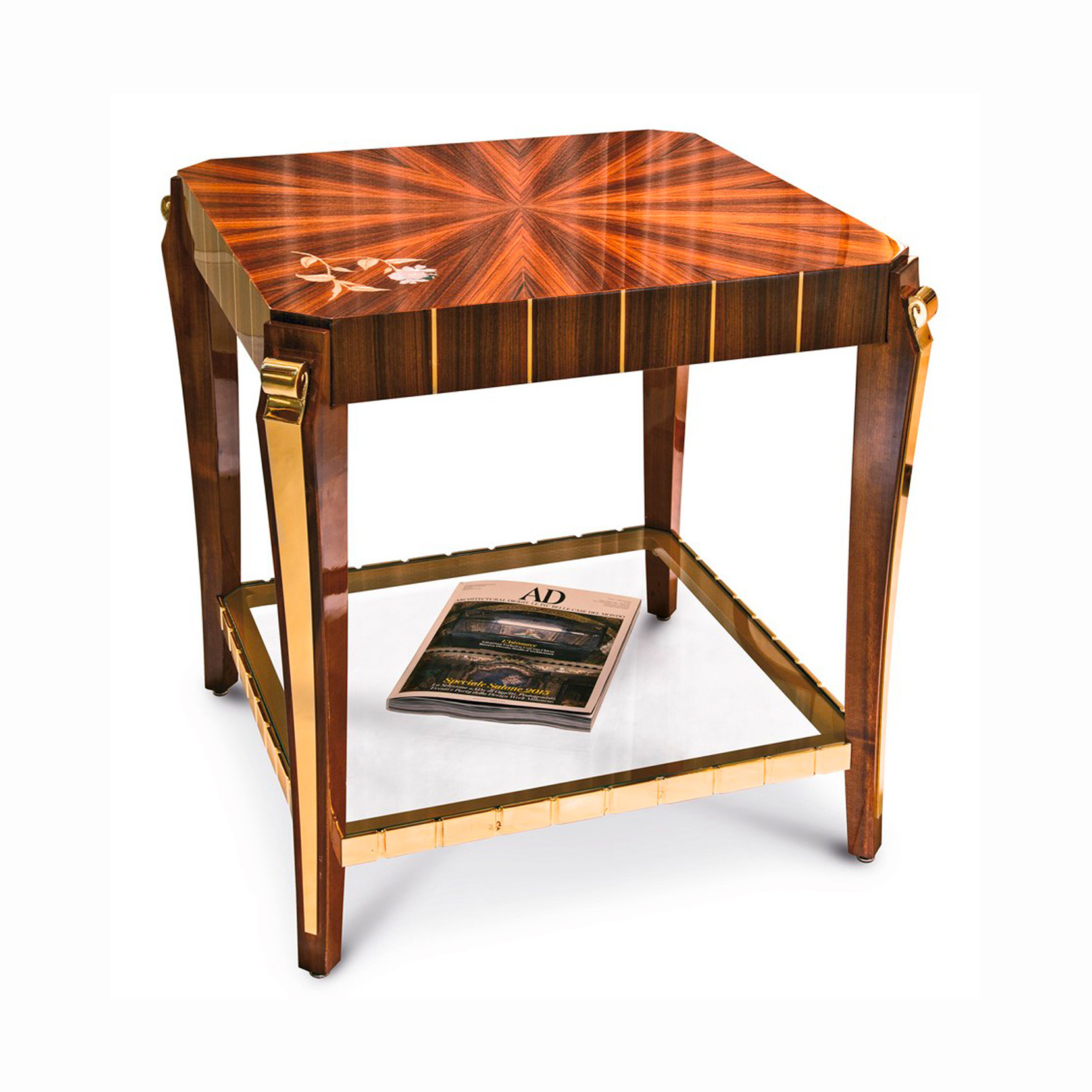 Square side table, top veneered in Santos rosewood, mother of pearl, brass, metal elements