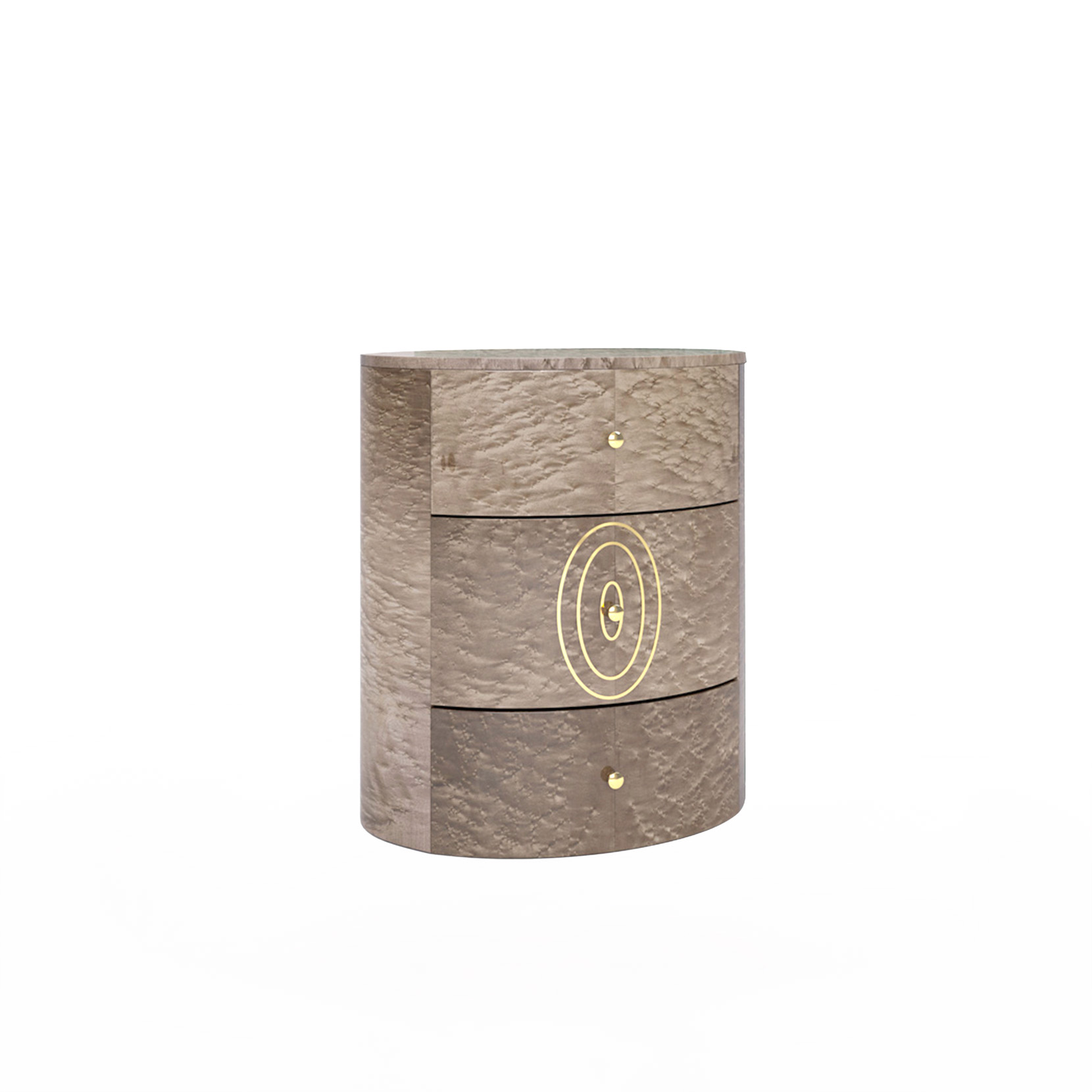 Nightstand with bird's eye maple veneer in sand colour, metal elements.