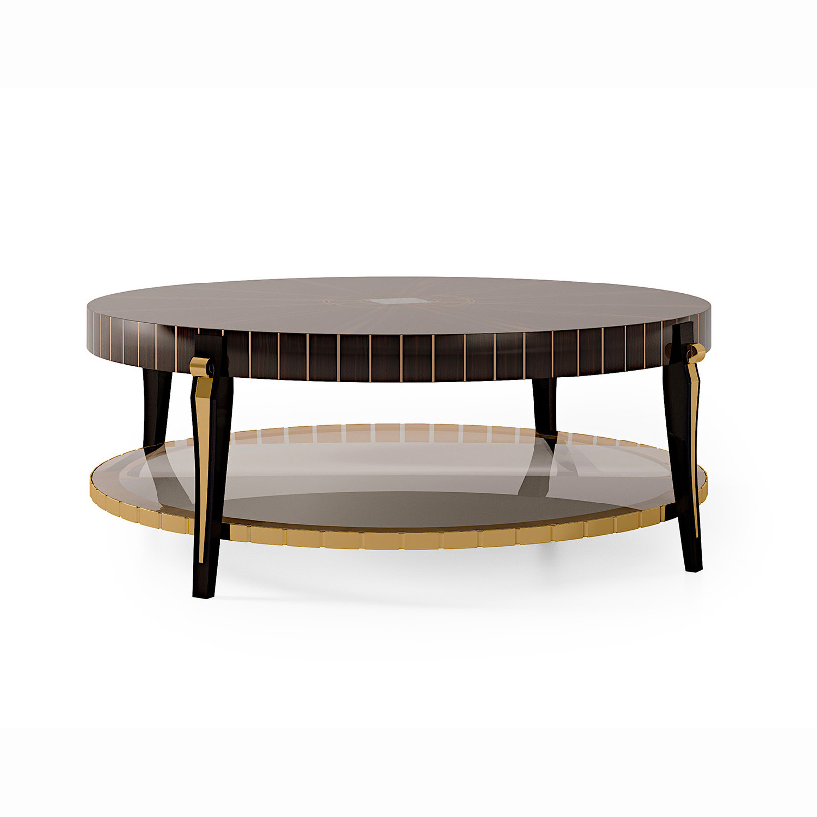 Oval coffee table, top veneered in Macassar ebony, mother of pearl, brass, metal elements