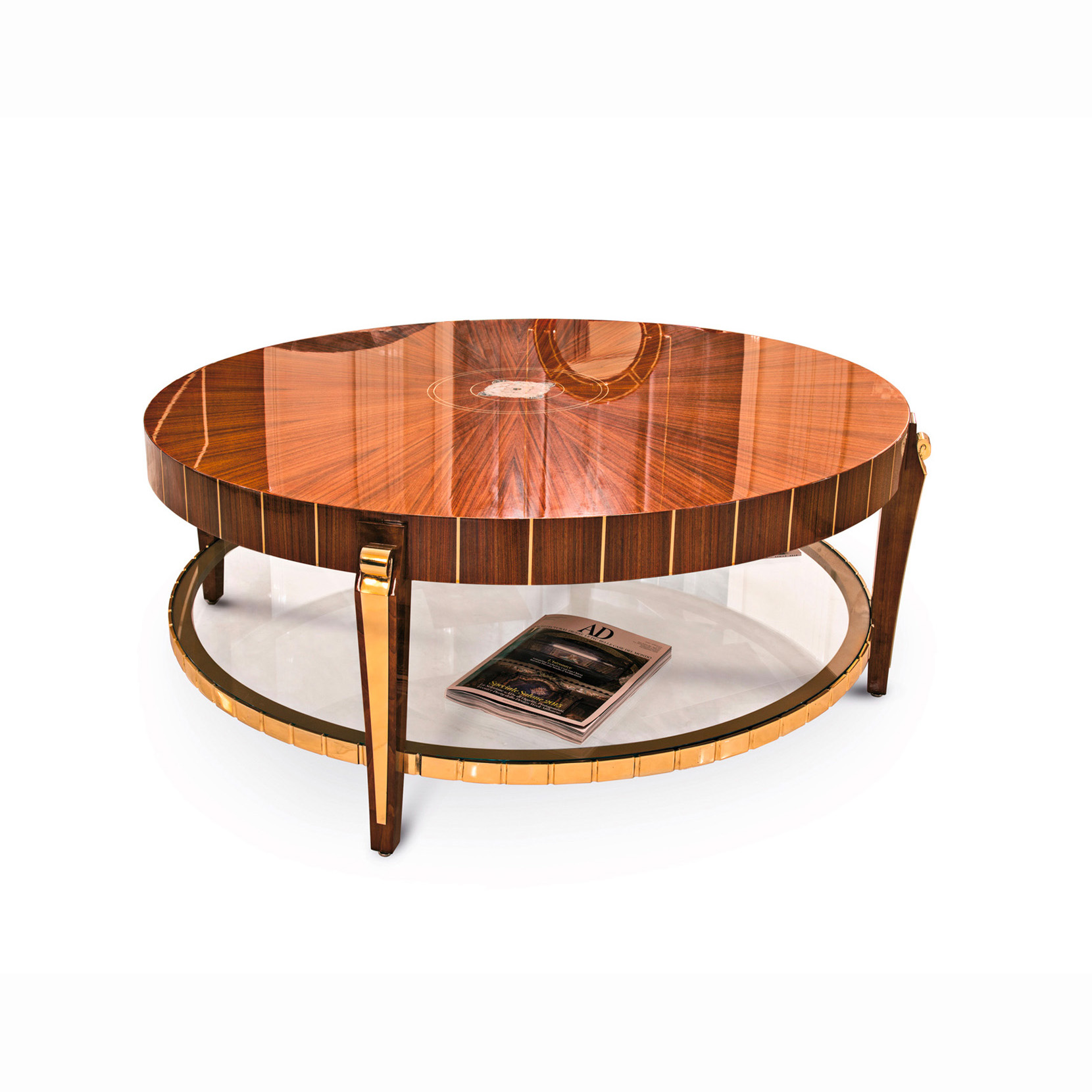 Round coffee table, top veneered in Santos rosewood, mother of pearl, brass, metal elements