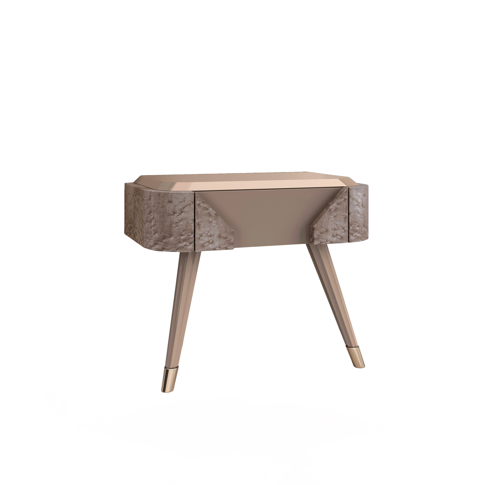 Nightstand with bird's eye maple veneer in clay colour, matt lacquered parts.
