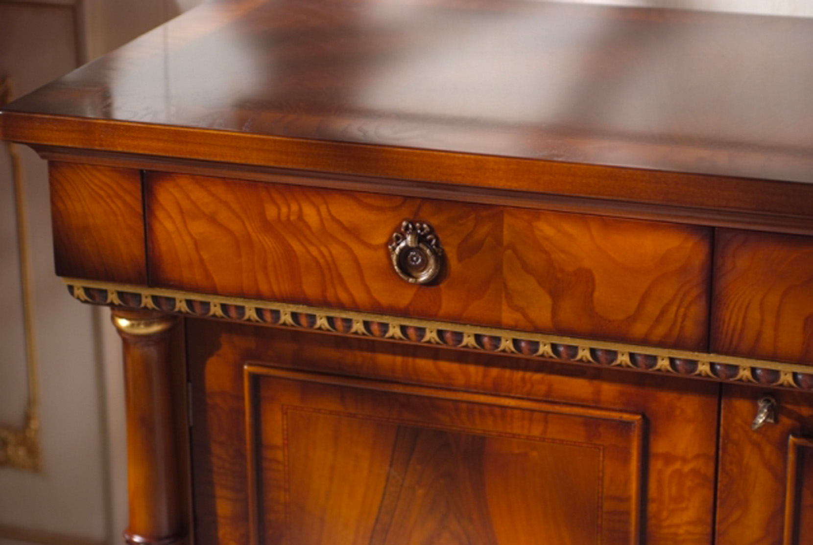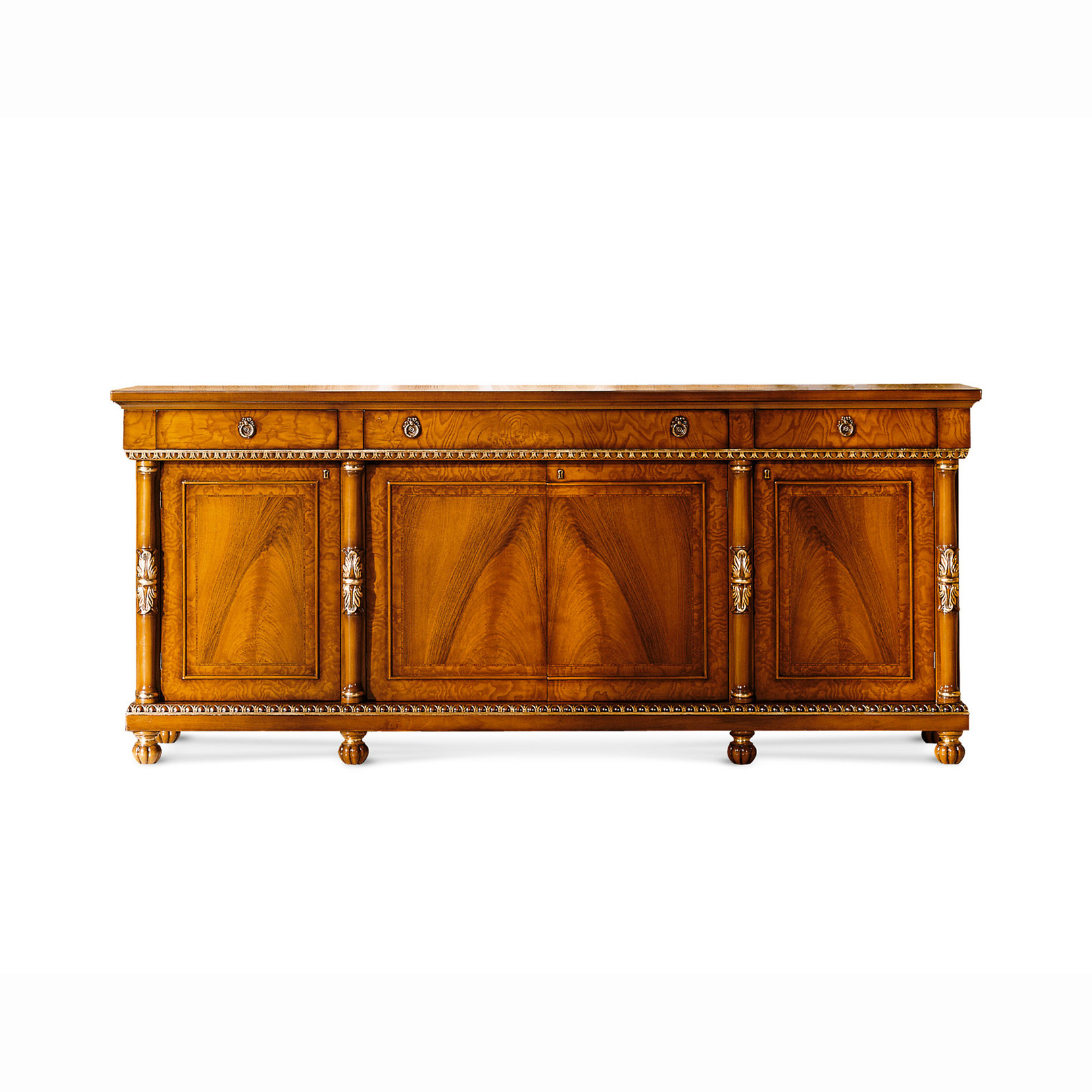 Sideboard with 4 doors and 3 drawers, veneered in walnut feather and ash burl