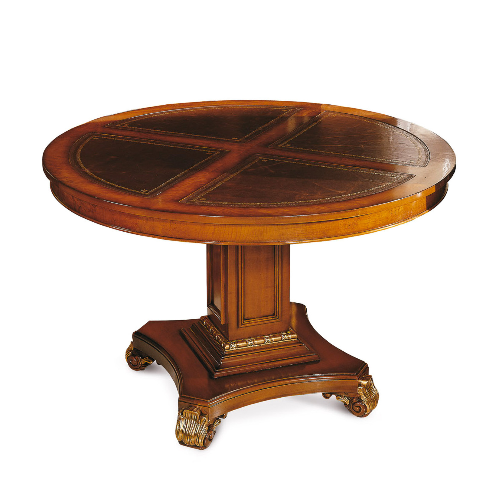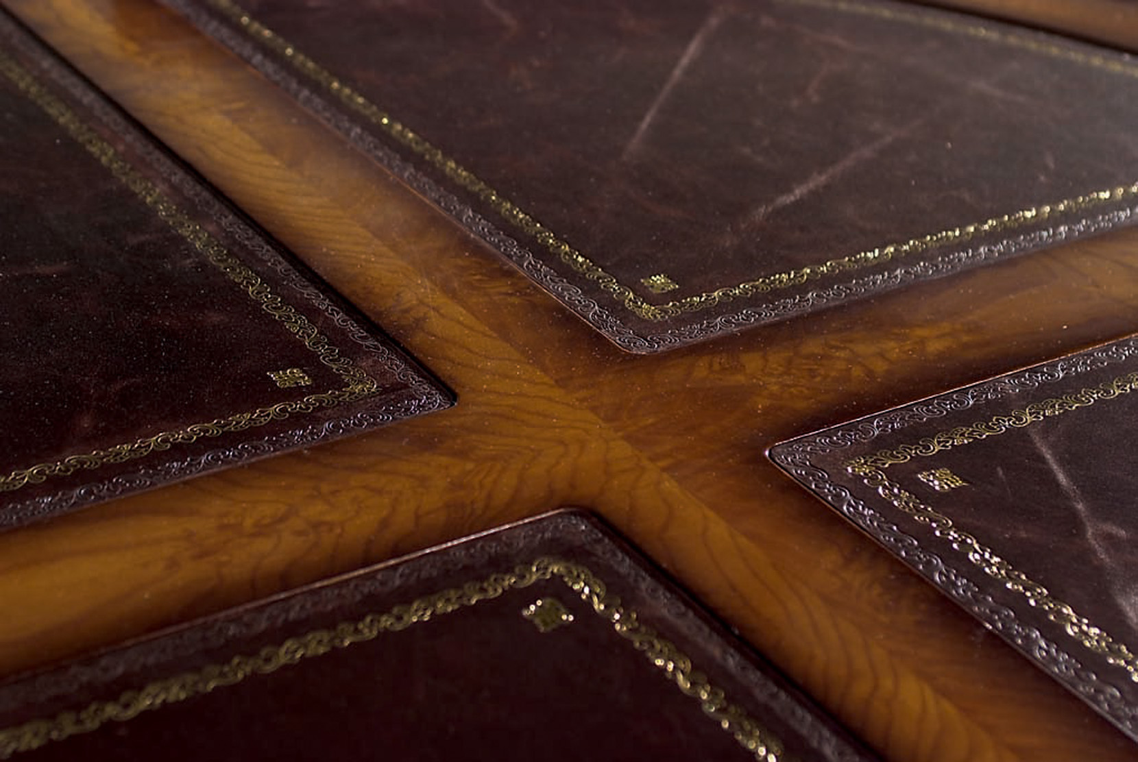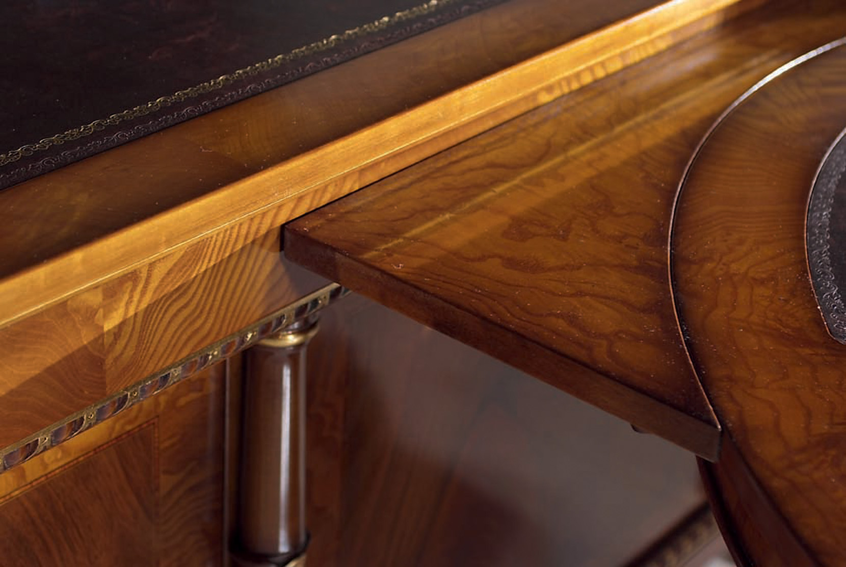 Desk veneered in walnut feather and ash burl, gold leaf details