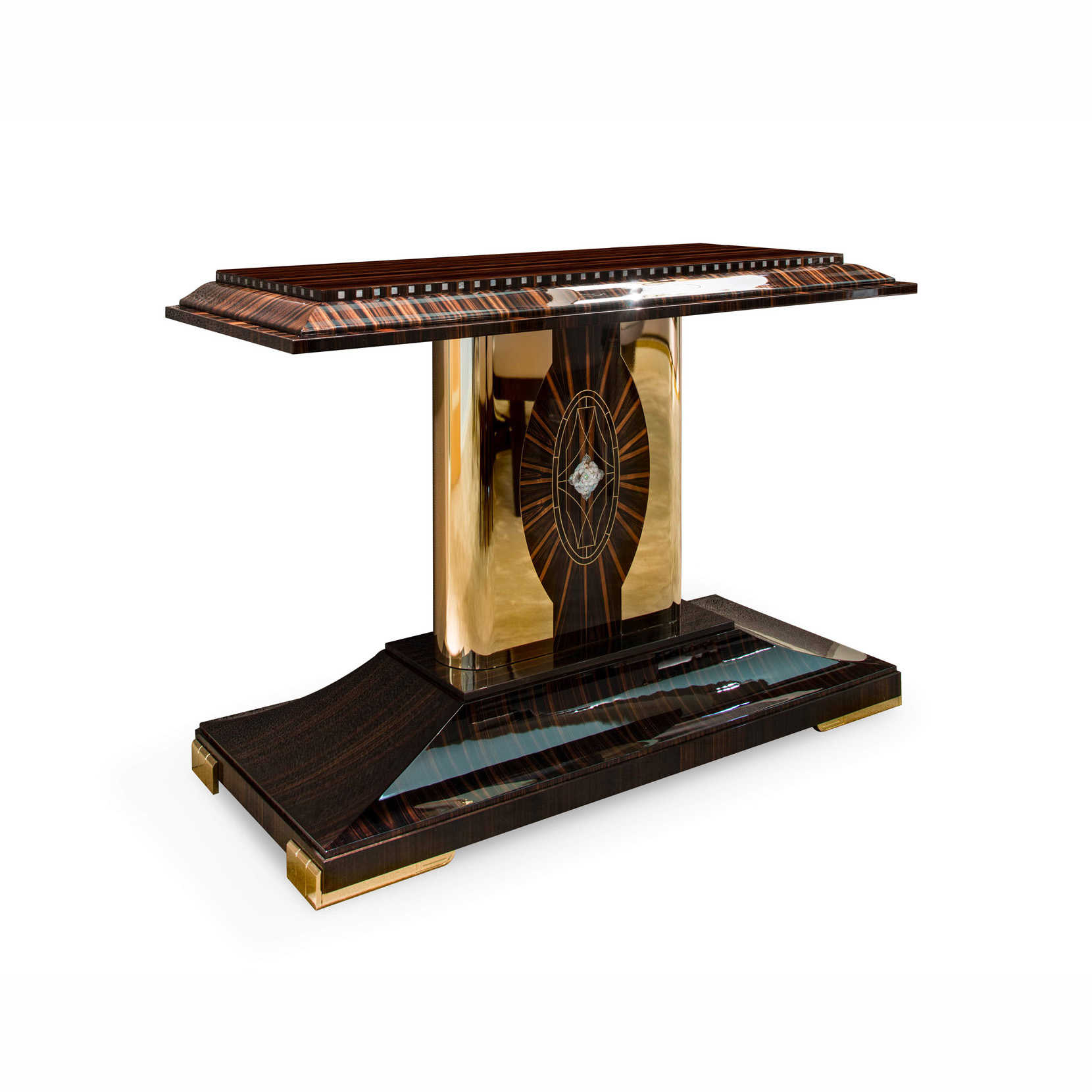 Console table veneered in Macassar ebony, brass, mother of pearl, metal elements,