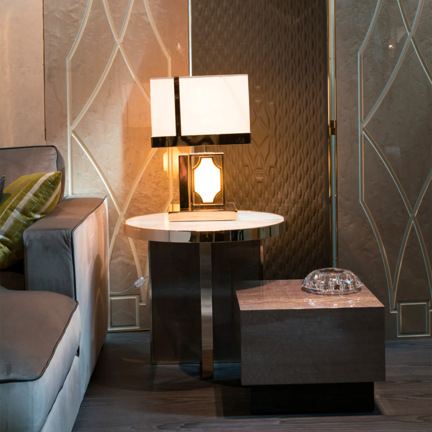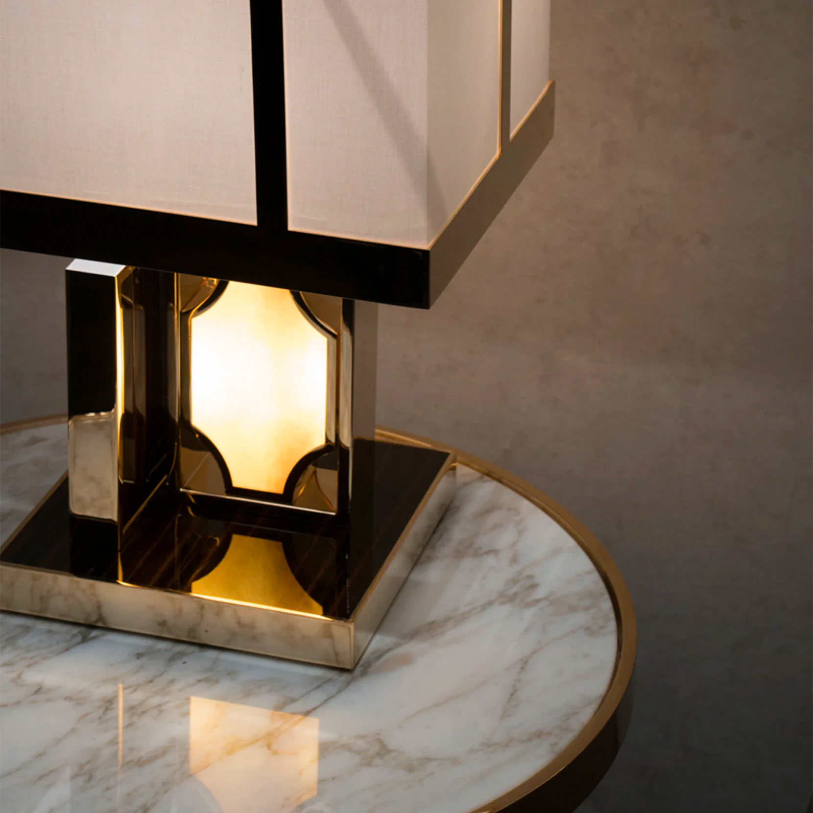 Table lamp in 24k gold-plated metal frame, onyx, ebony veneer, LED lighting.