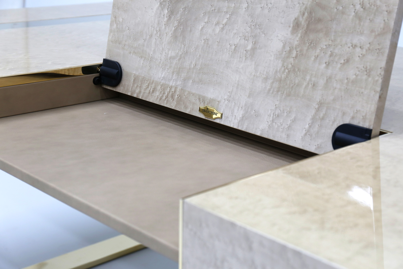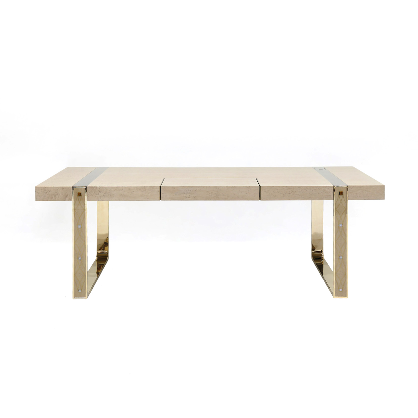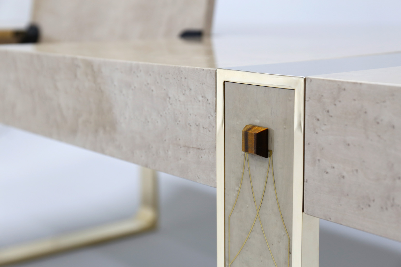 Desk veneered in Bird's eye maple sand color, mother of pearl, brass, metal elements