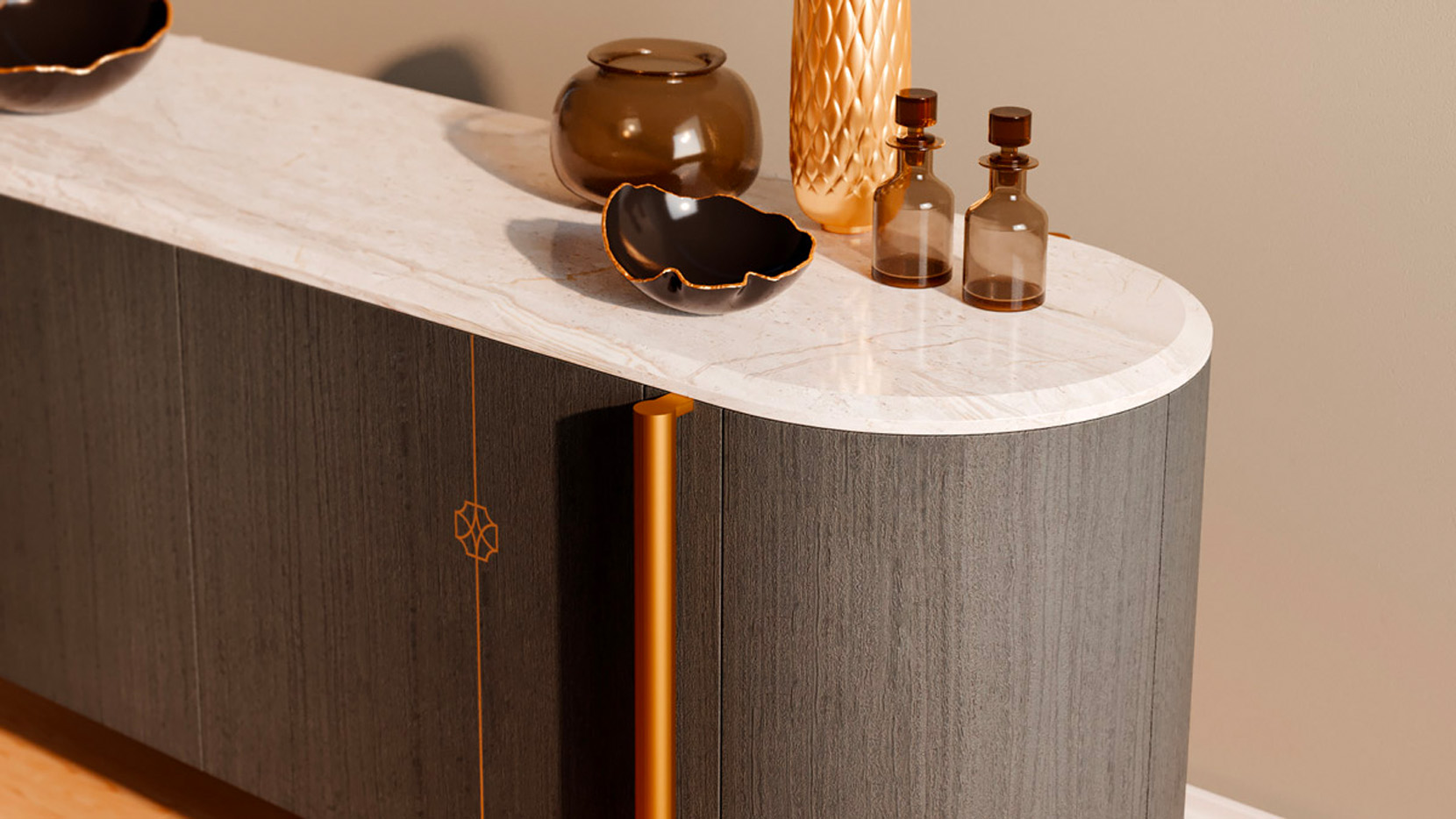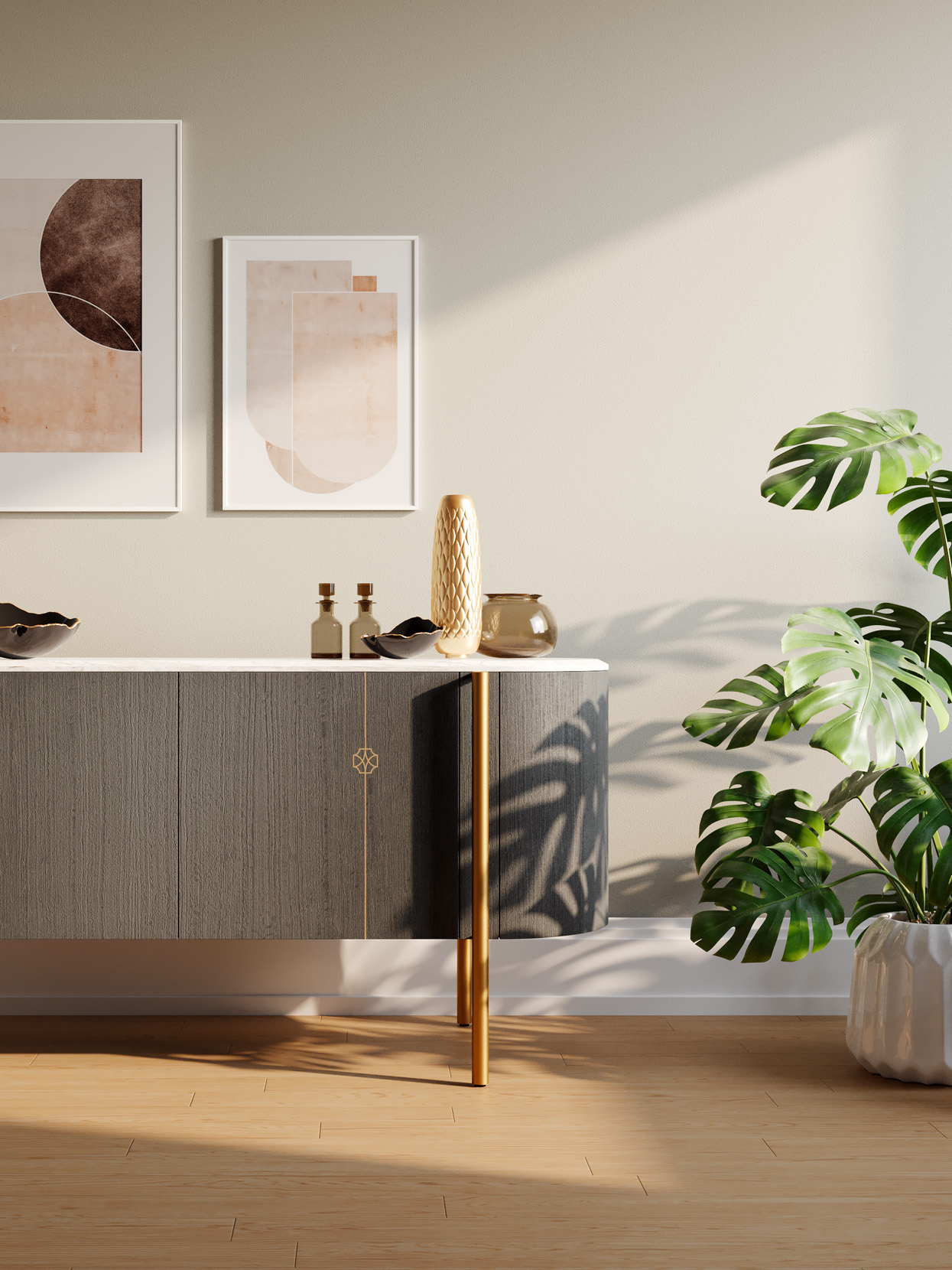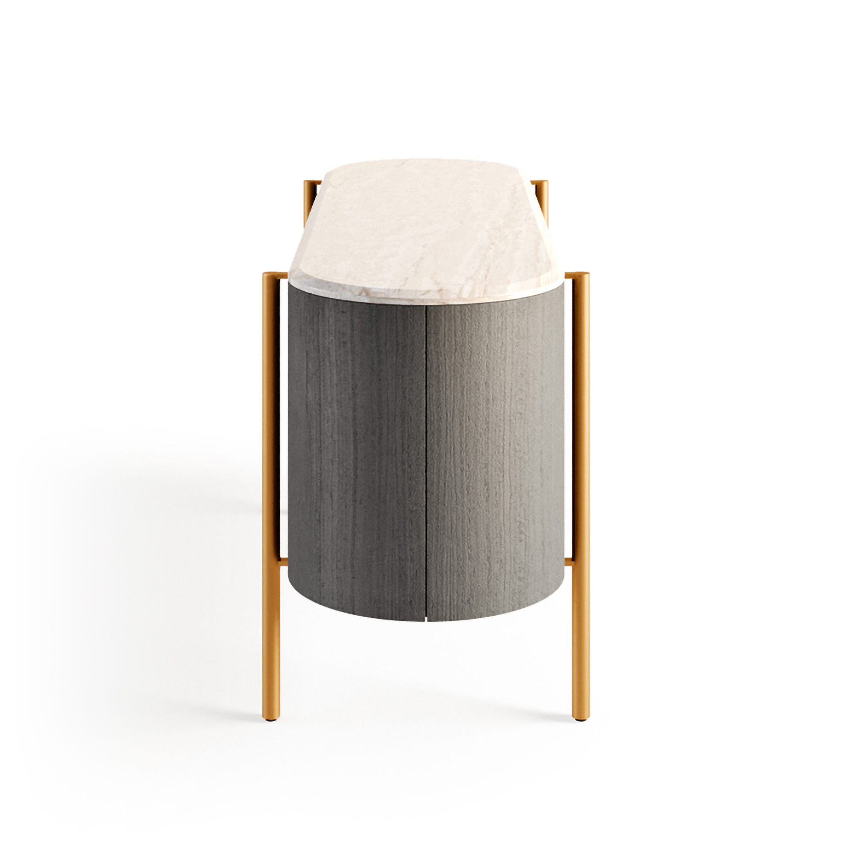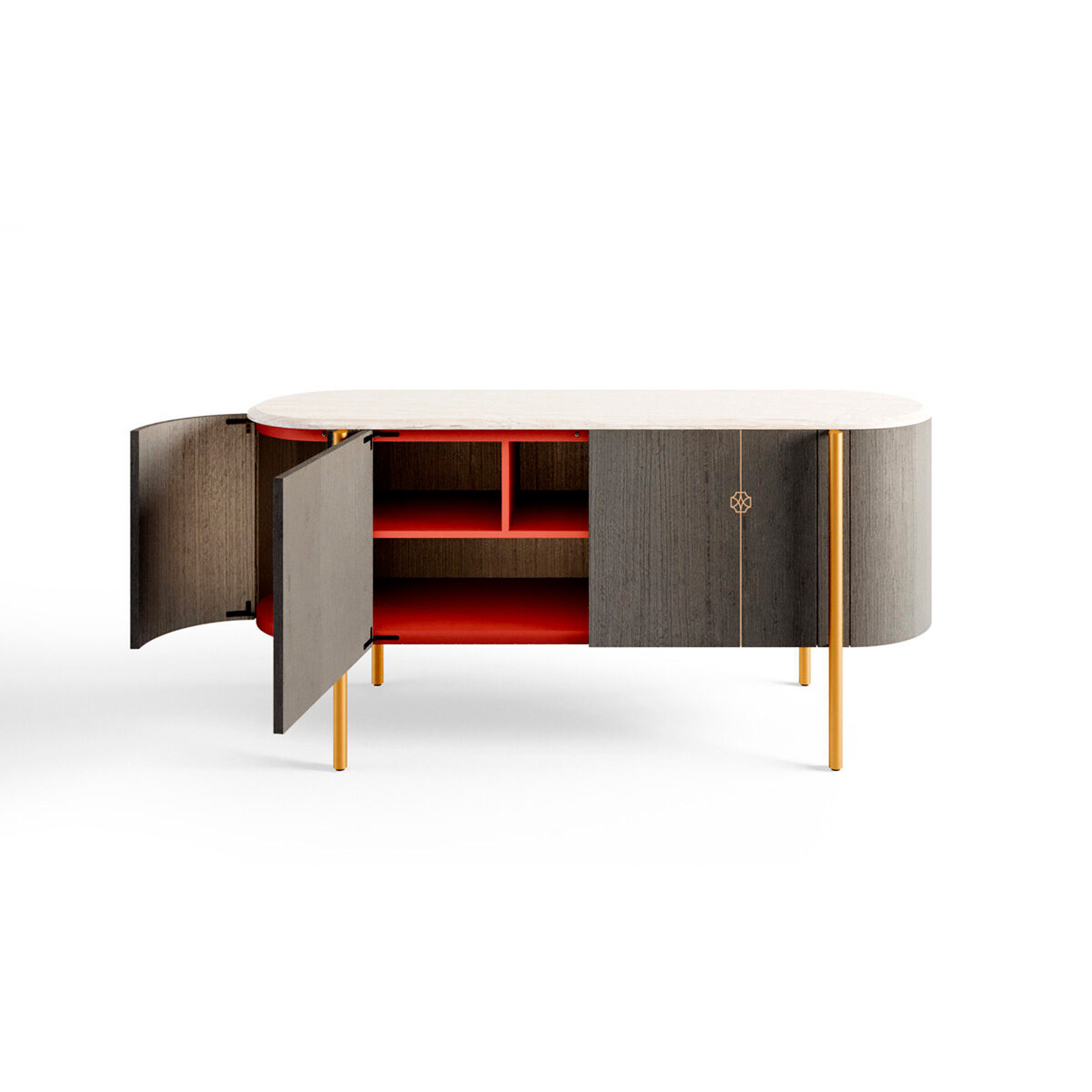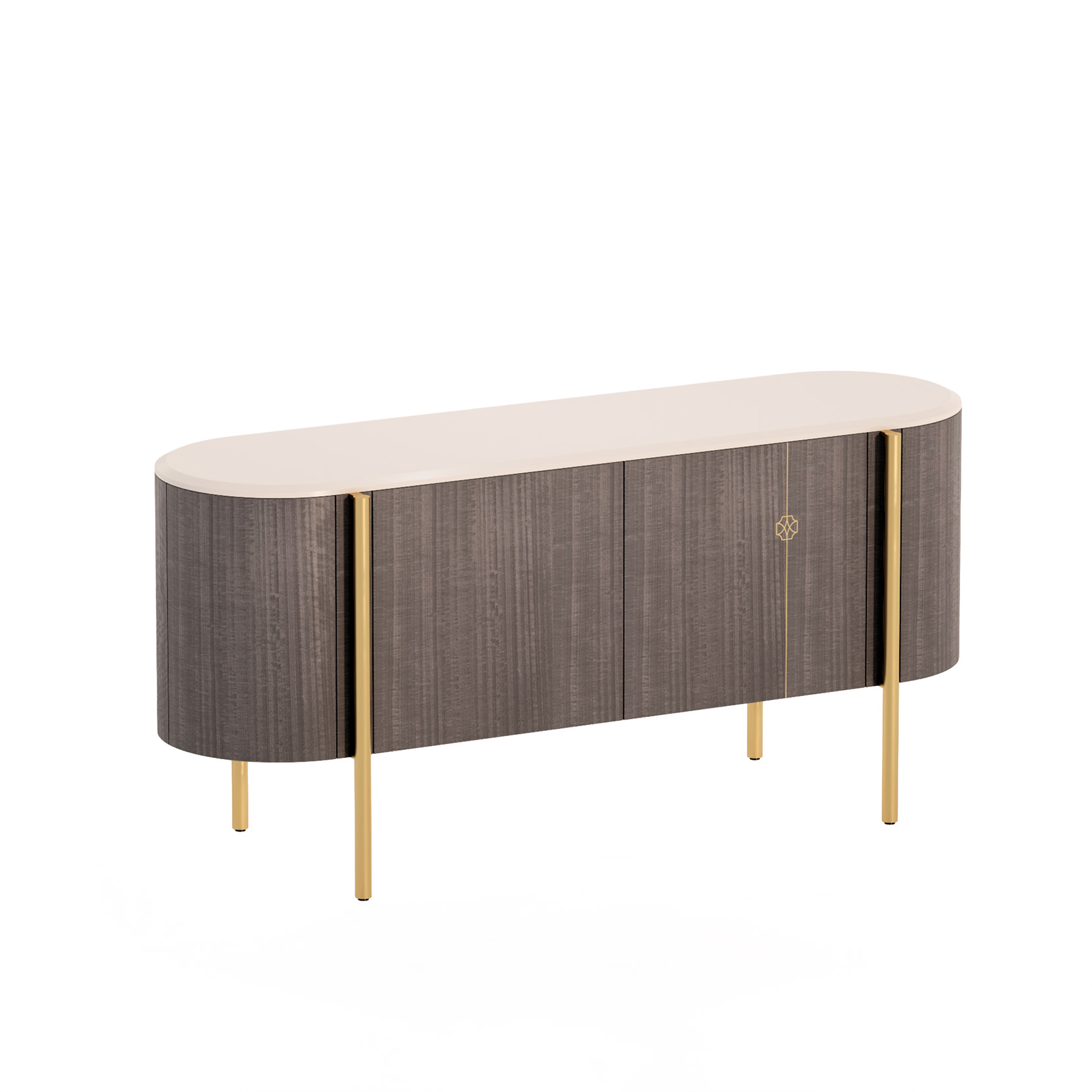 4-door sideboard with anthracite eucalyptus veneer (plain vertical grain), matt lacquered top, metal legs.