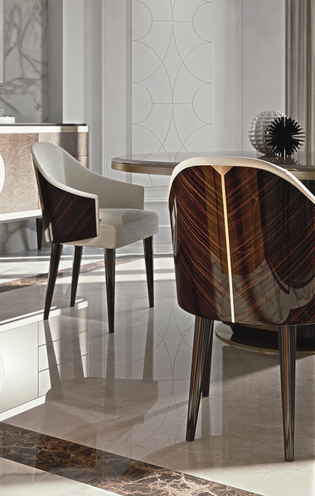 Chair with armrests, ebony veneer backrest, matt lacquered parts, fabric upholstery.