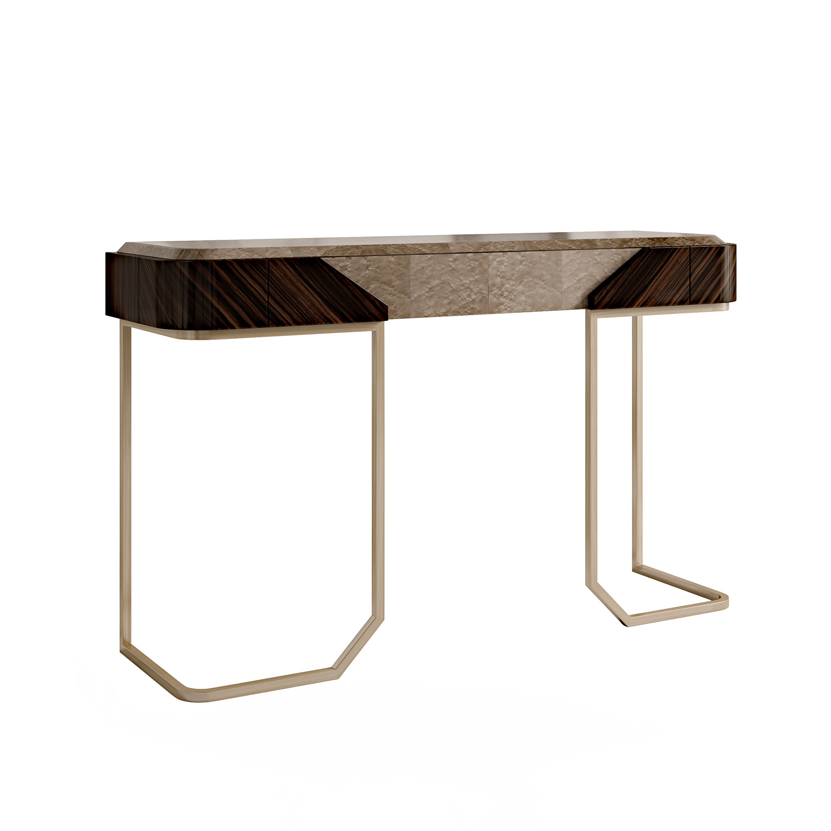 1-drawer console with bird's eye maple veneer in clay colour, ebony veneer, metal structure.