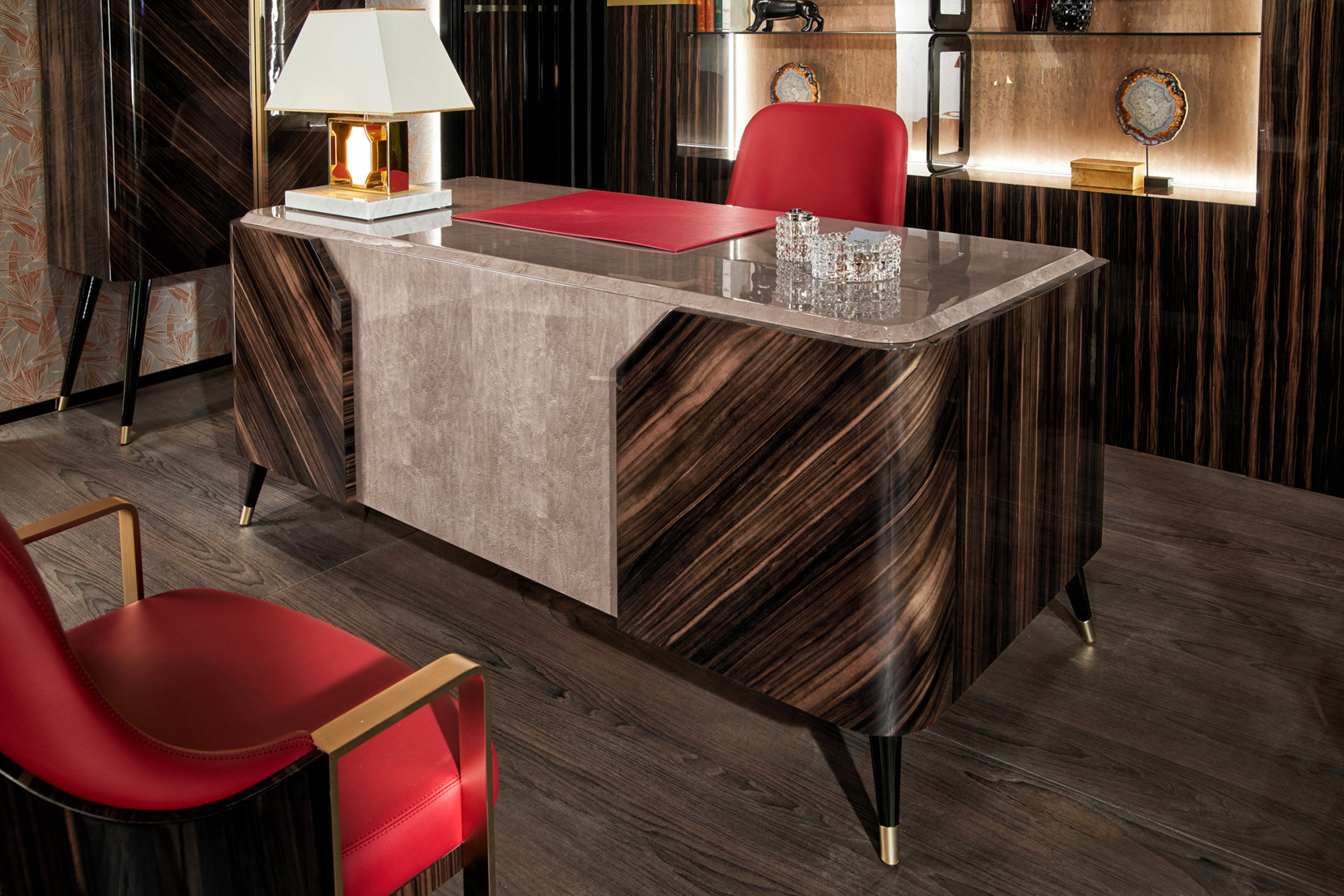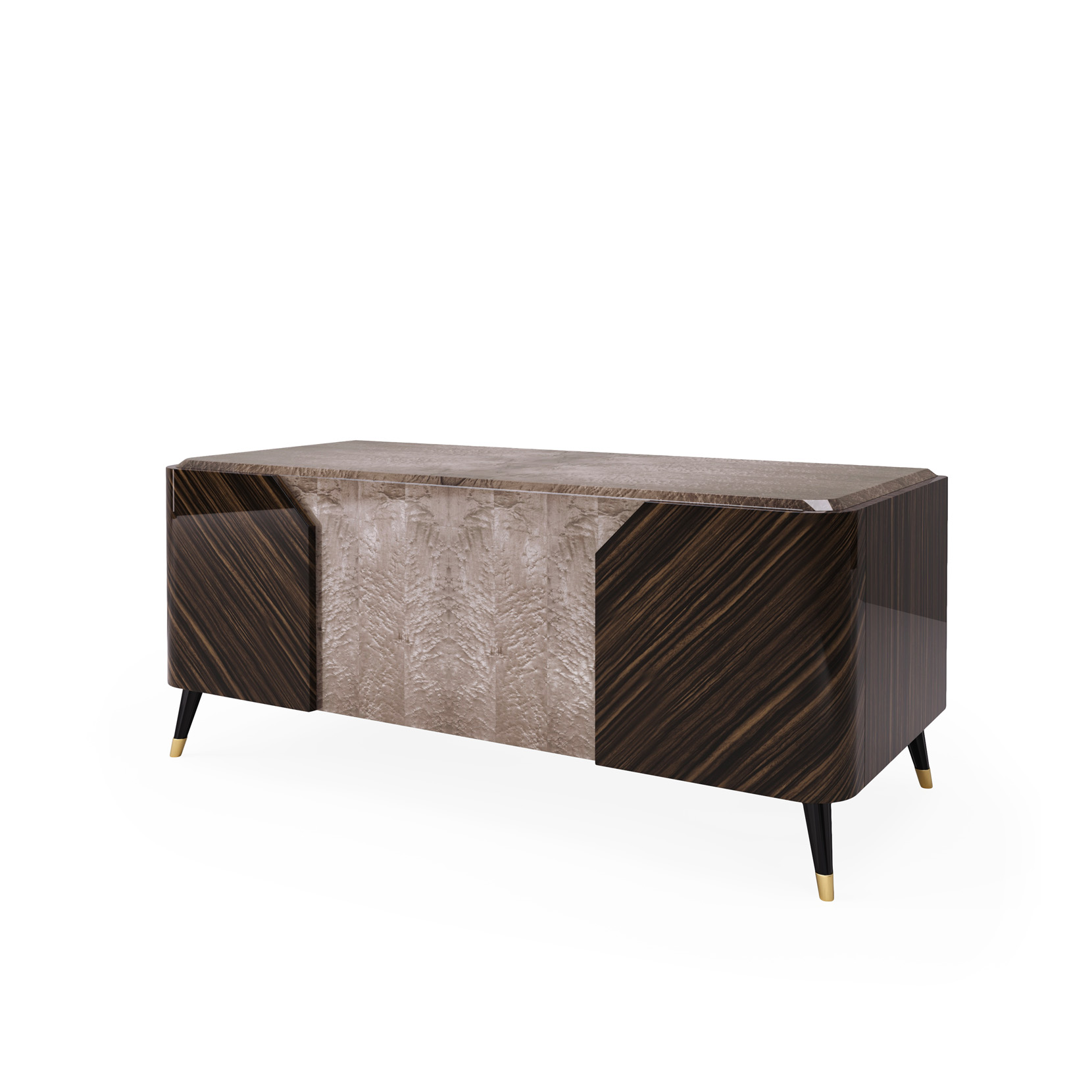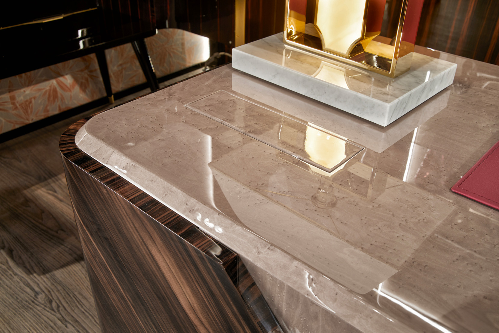 Writing desk with bird's eye maple veneer in clay colour, ebony veneer, matt lacquered parts, metal elements in shiny light gold finish.