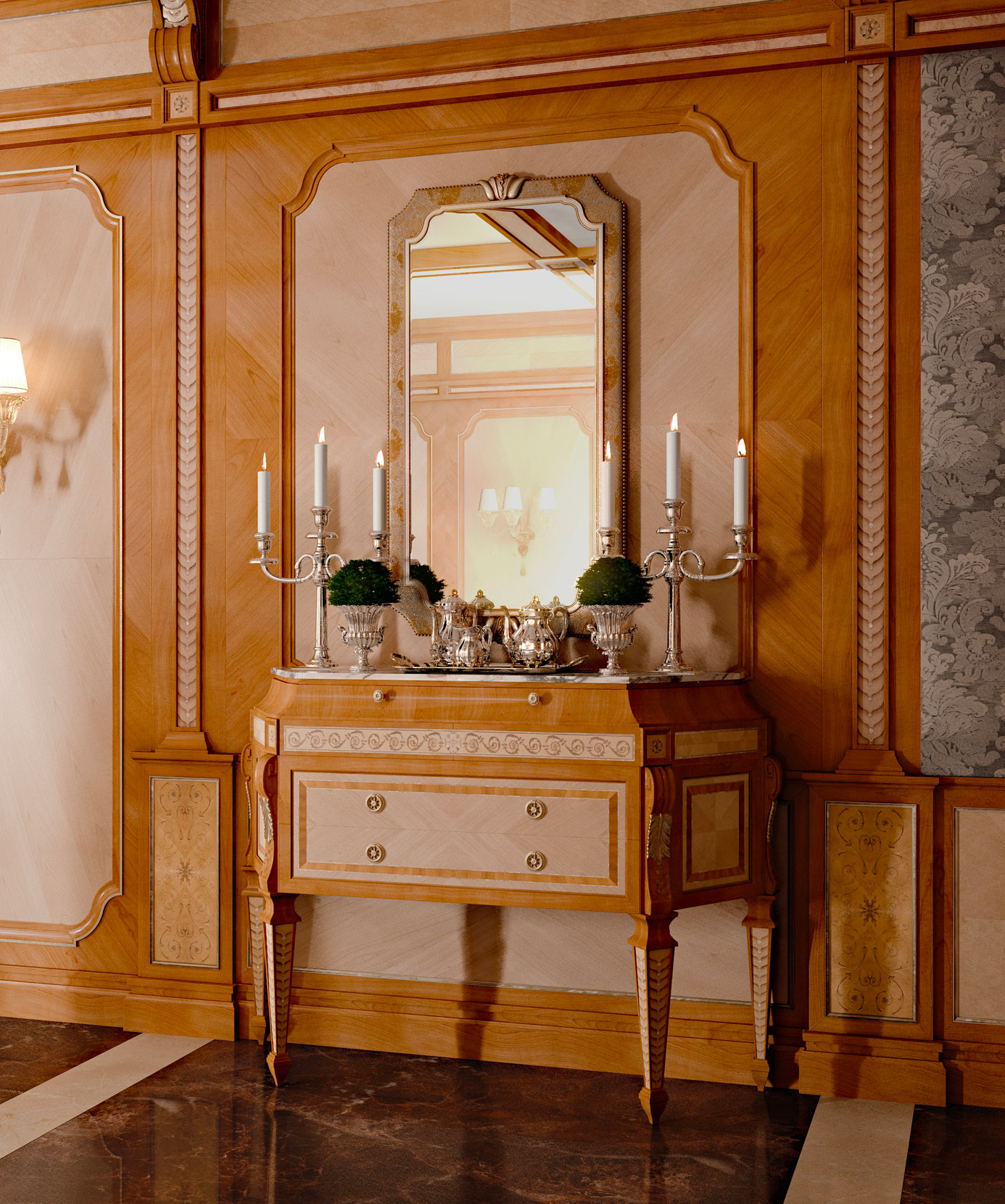 Console table veneered in white maple and cherry wood with inlay in pewter & mother of pearl. Marble top Calacatta purple