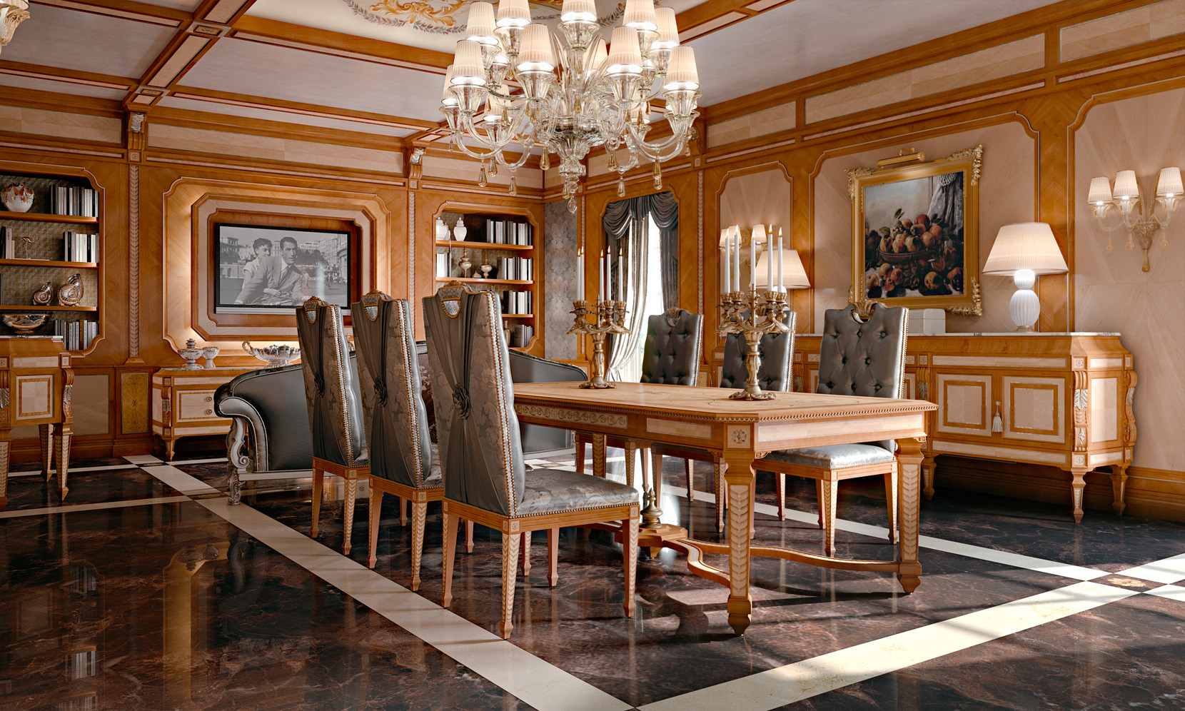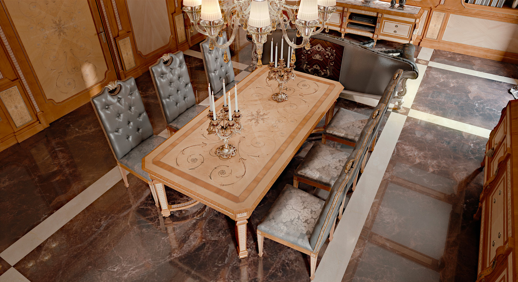 Rectangular extendible table veneered in white maple and cherry wood with inlay in pewter & mother of pearl