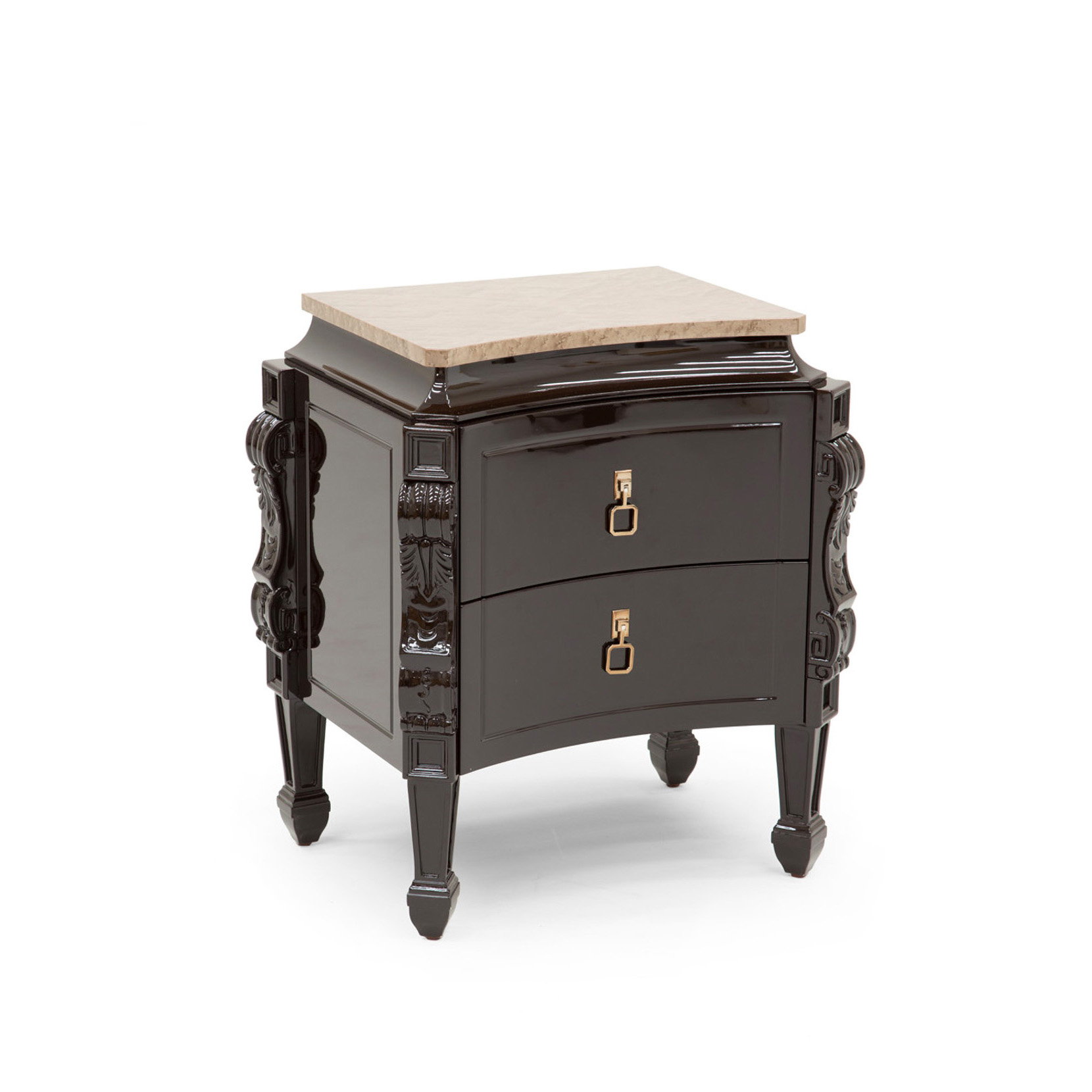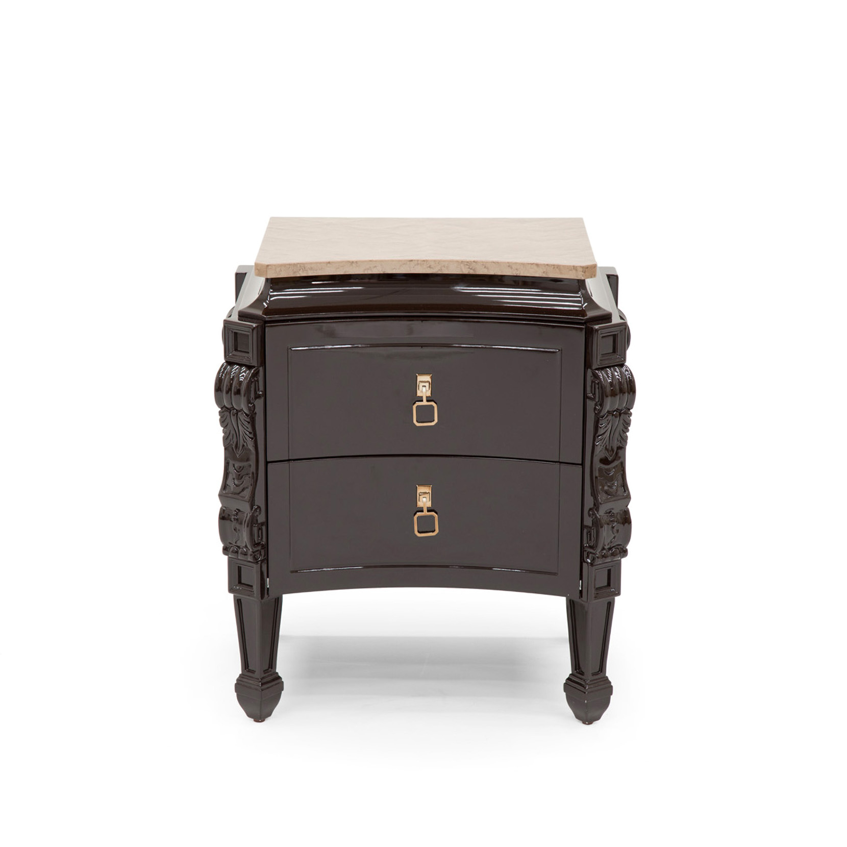 Nightstand , top veneered in bird's eye maple clay color, carved wood