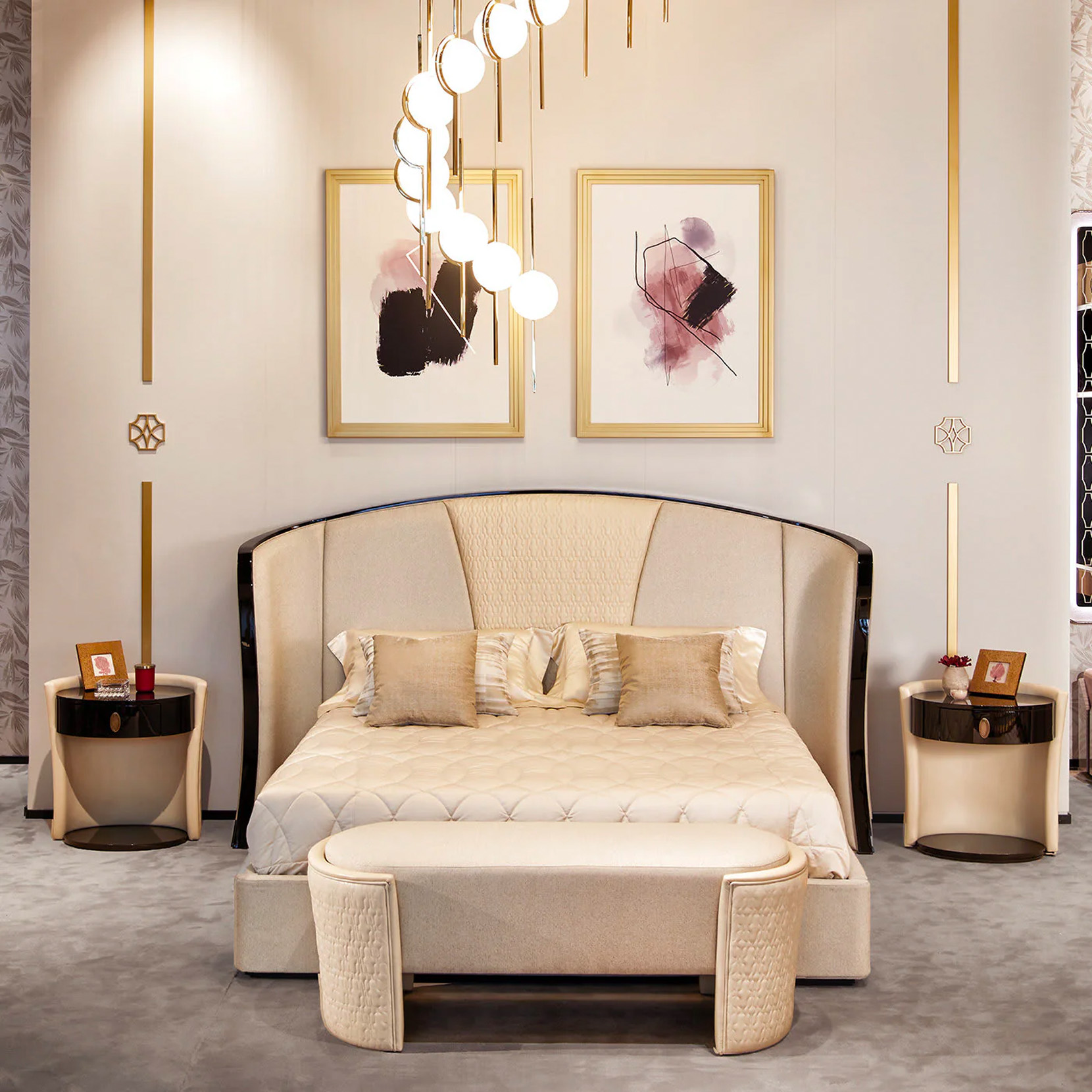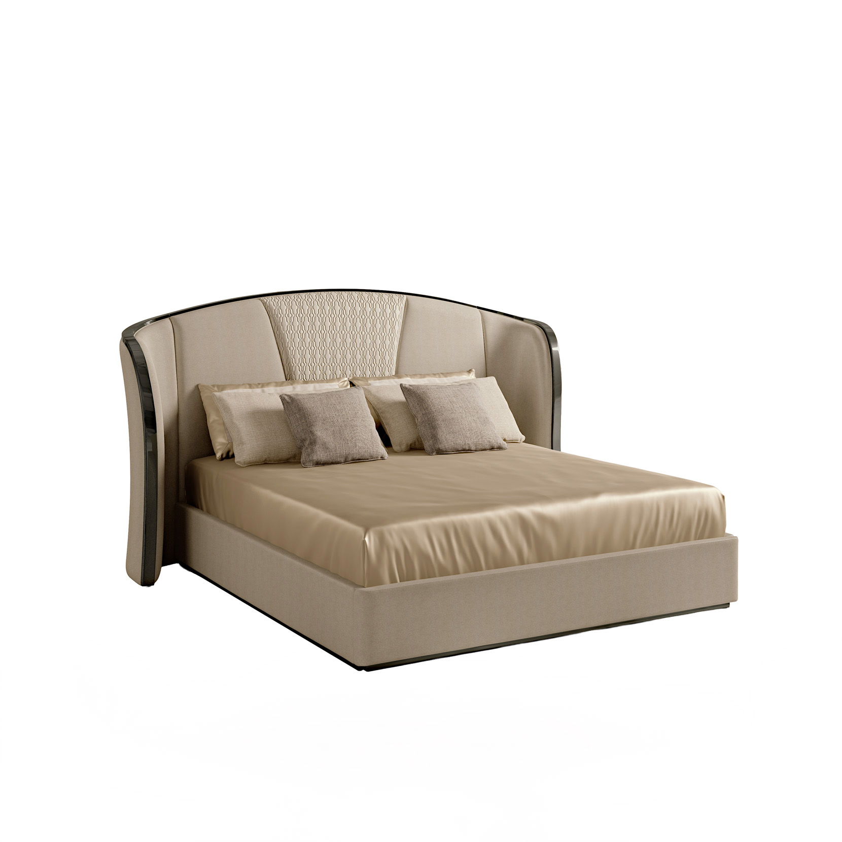Bed with matt lacquered parts, leather upholstery with quilted parts.