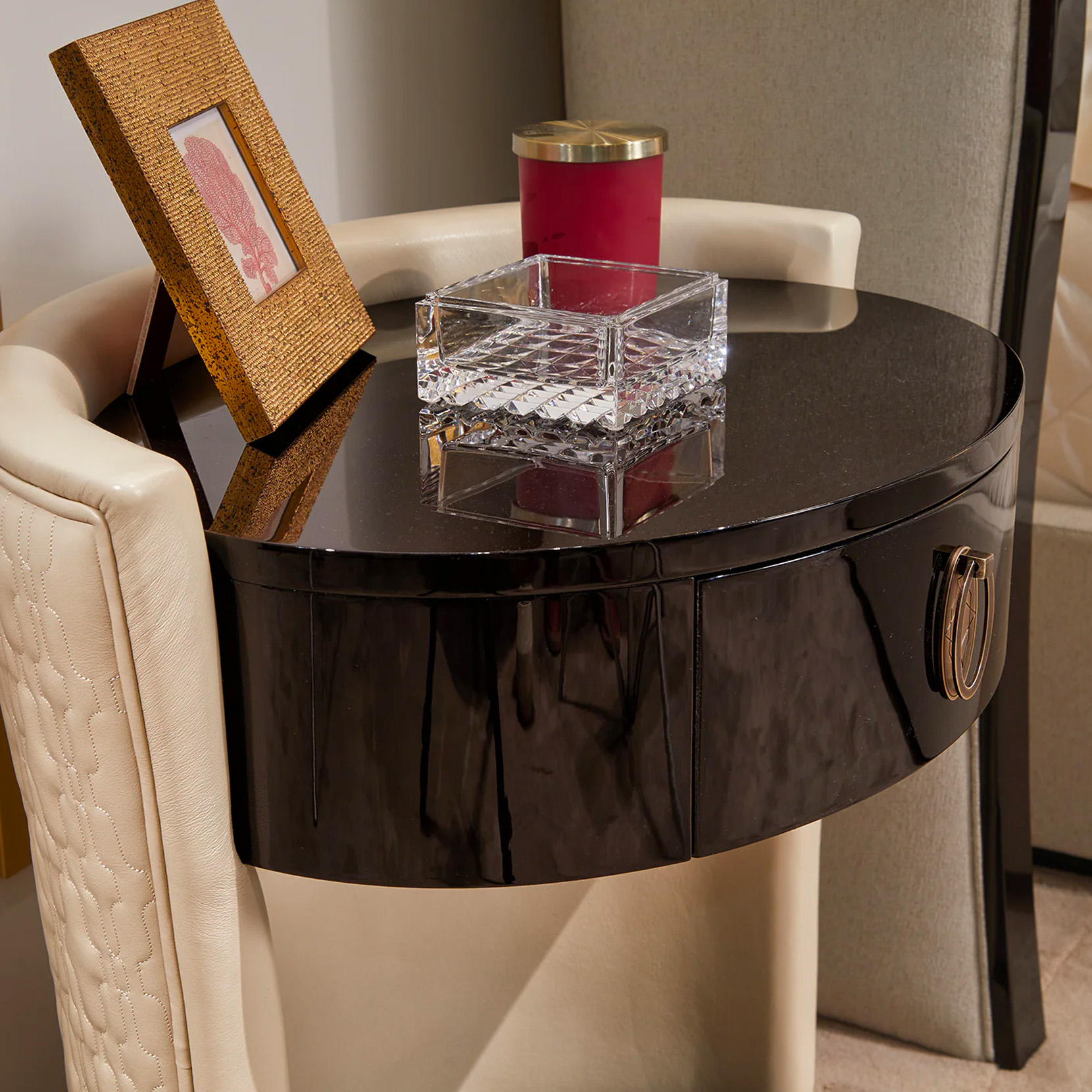 Nightstand with matt lacquered parts, leather upholstery with quilted back, metal elements.