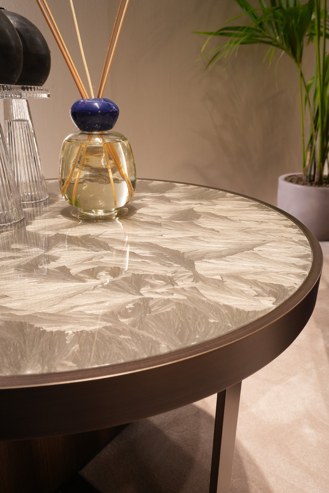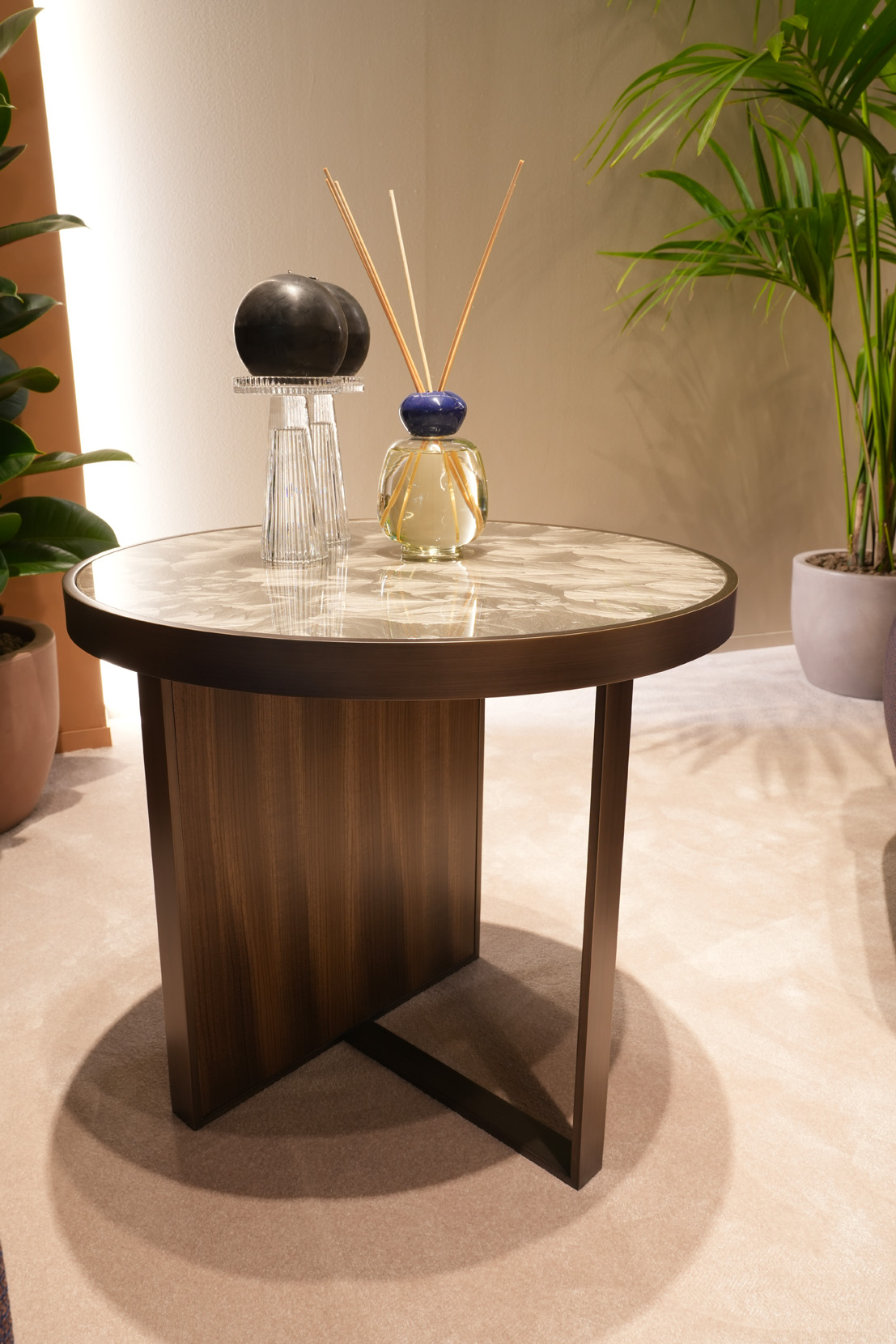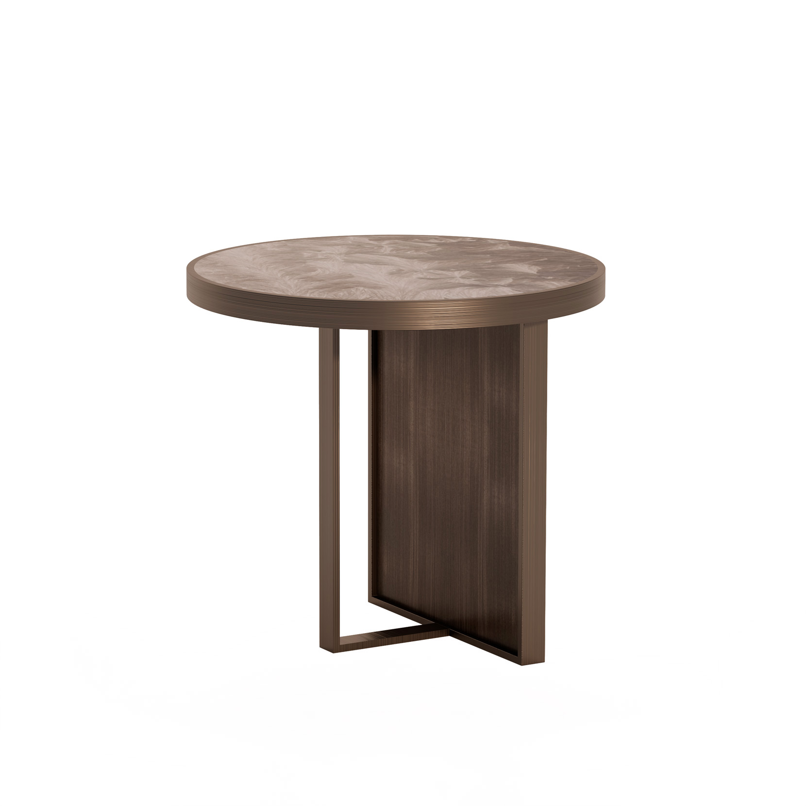 Round side table with zebrano veneer top and side panel in suede colour, metal elements in brushed bronze finish.