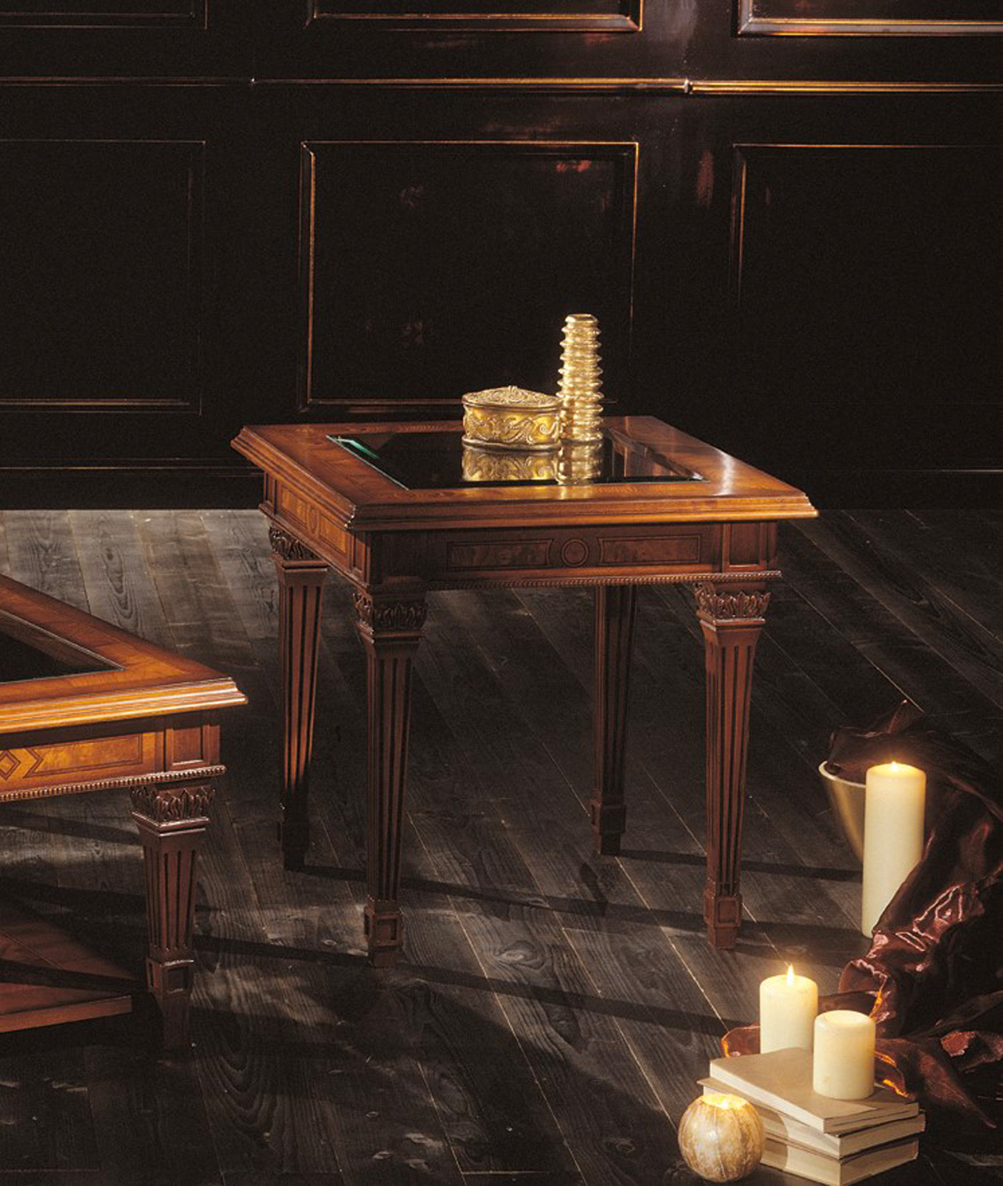 Side table w/ 4 legs, top with glass , veneered in Walnut and Ash burl
