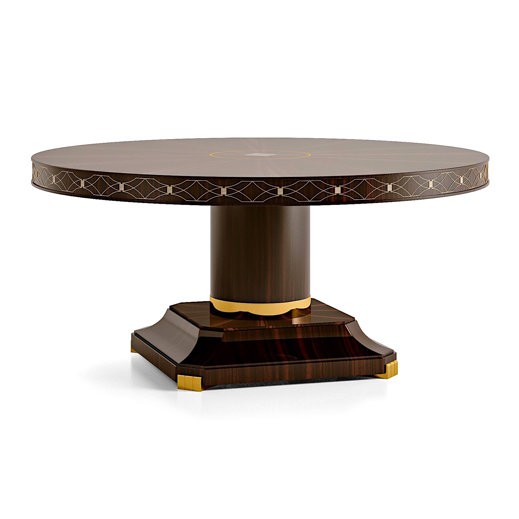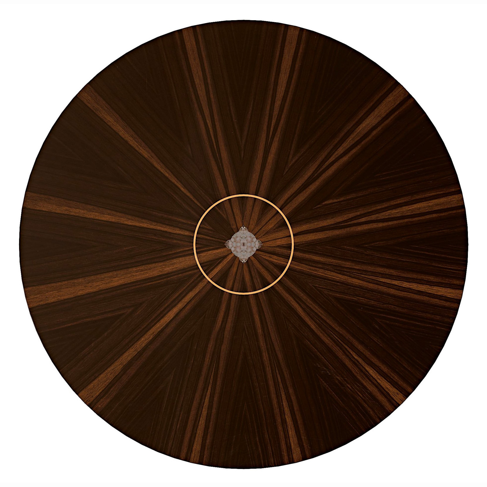 Fixed rounded table with pedestal, veneered in macassar ebony mother of pearl, brass