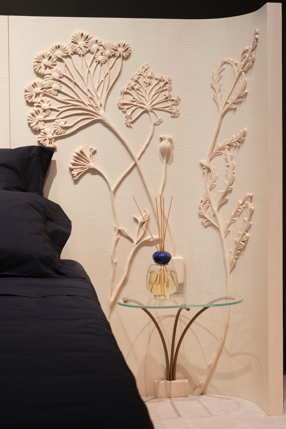 Bedside with whitened maple veneer parts, metal structure, glass top.